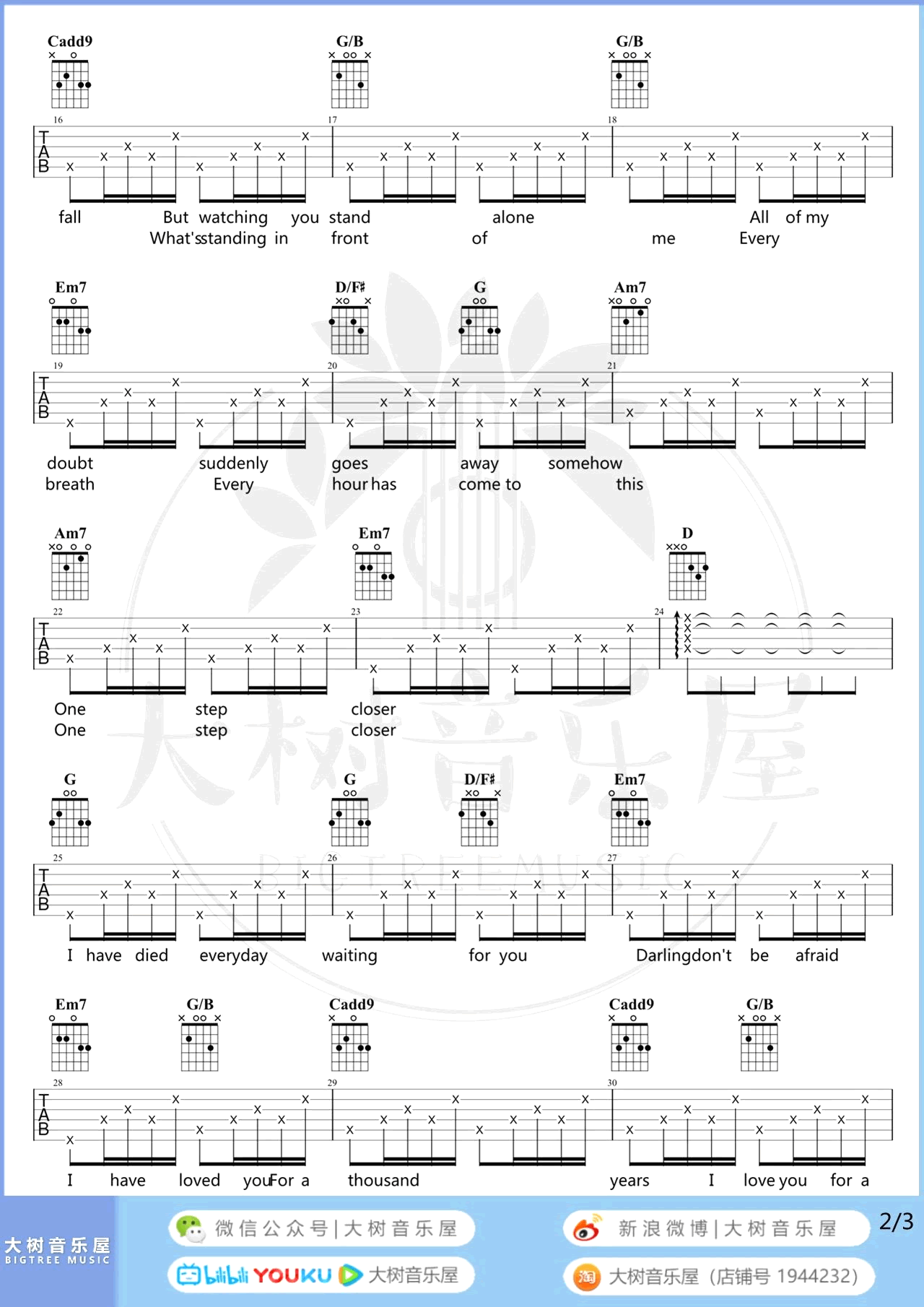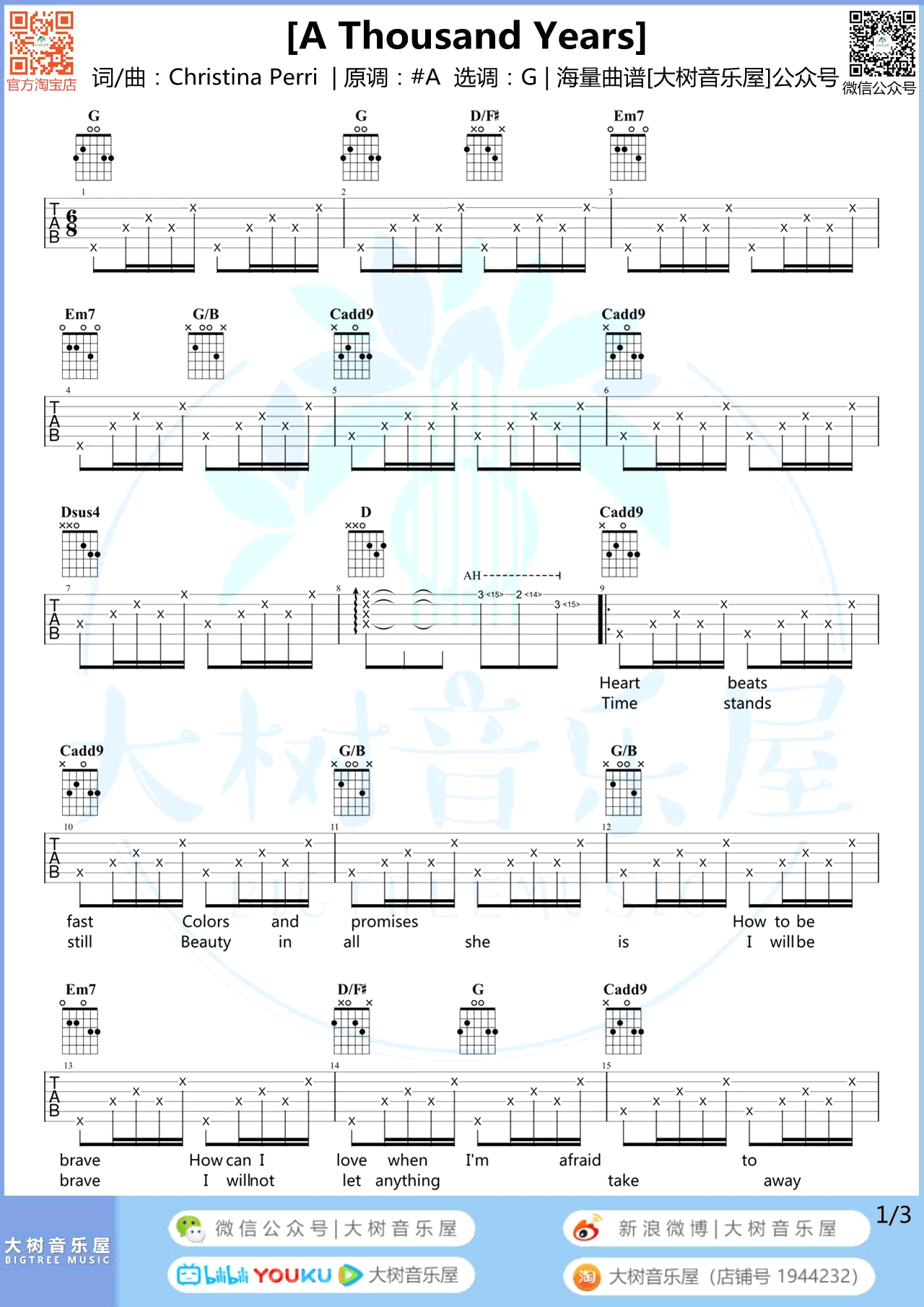 A Thousand Years吉他谱,Christina Perri演唱的一首超唯美神曲,A Thousand Years吉他六线谱,选用G调指法编配,变调夹夹三品,三张弹唱图片谱。感谢大树音乐屋编配分享,易唱网上传更新。我用尽生命中的每一天,只为等你出现,大热电影《Breaking Dawn(暮光之城4)》主题曲。歌曲用到了分解和扫弦两个节奏型,以及泛音演奏和勾弦技巧,大家可以参照橙子老师带来的吉他弹唱教学视频练习起来。