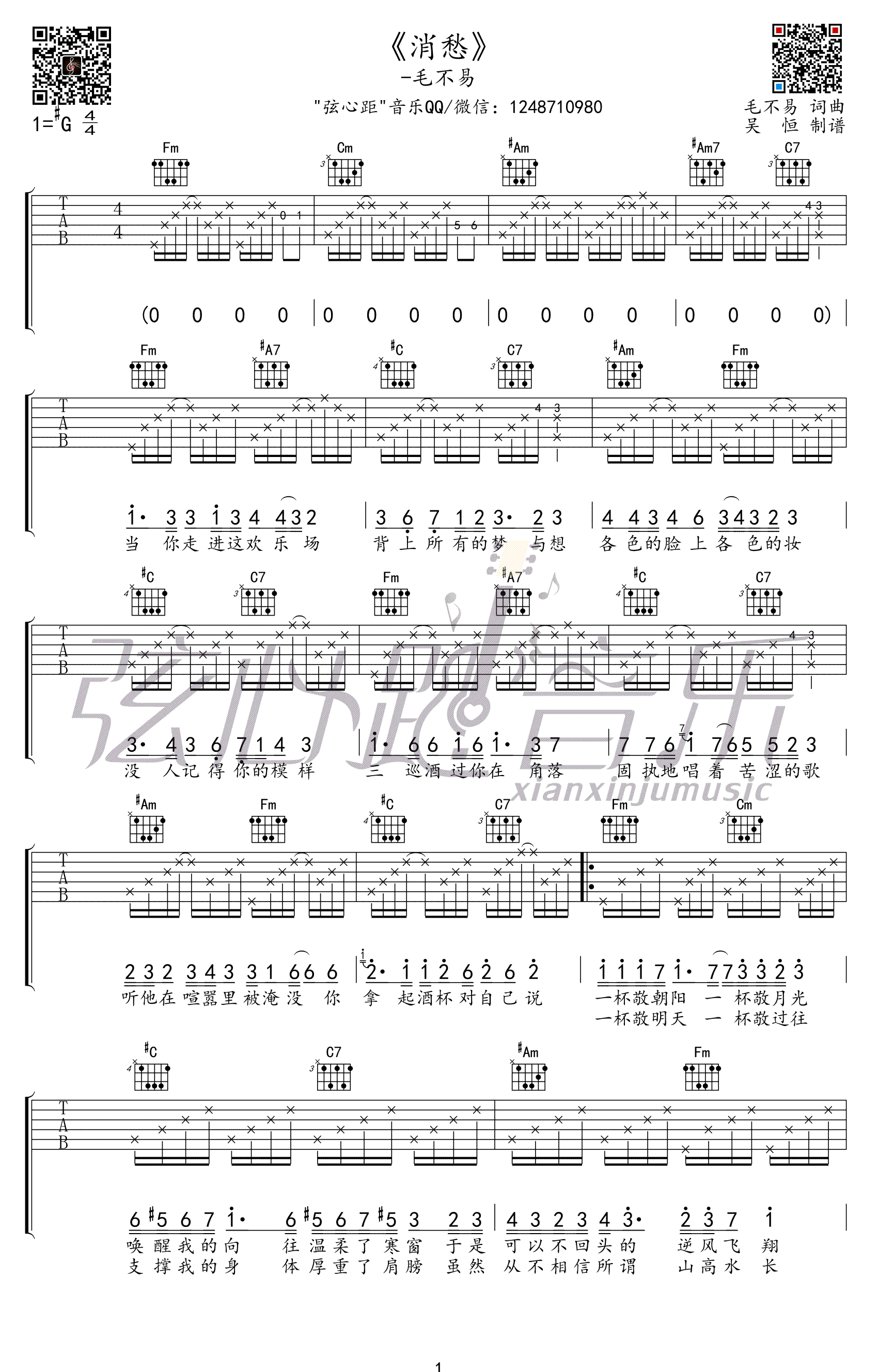 - 毛不易消愁吉他谱 《明日之子》高清弹唱谱 消愁六线谱