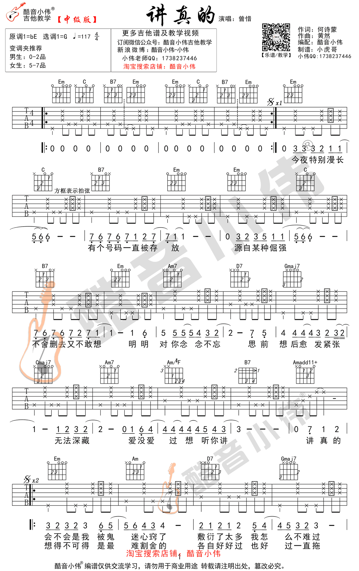 讲真的吉他谱,曾惜演唱热门抖音歌曲,《讲真的》吉他弹唱谱,原调bE,选用G调,男生变调夹推荐0-2品,女生变调夹推荐5-7品,酷音小伟编配,并提供吉他教学视频,易唱网推荐分享。