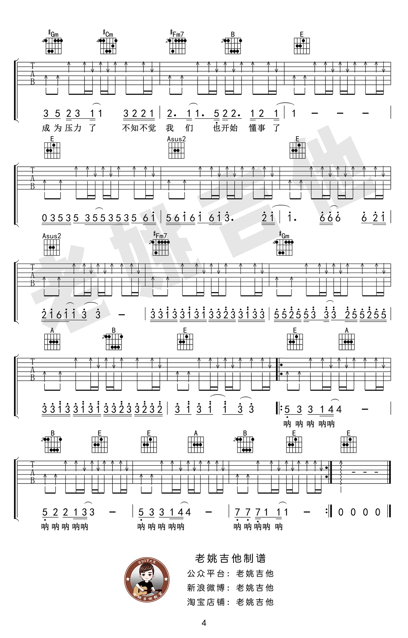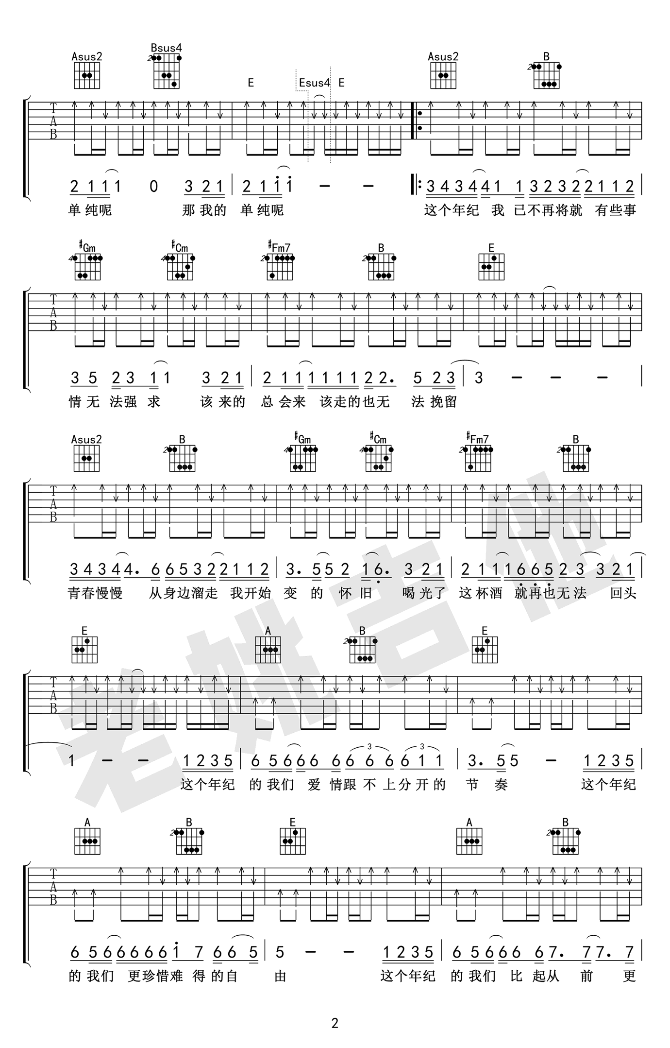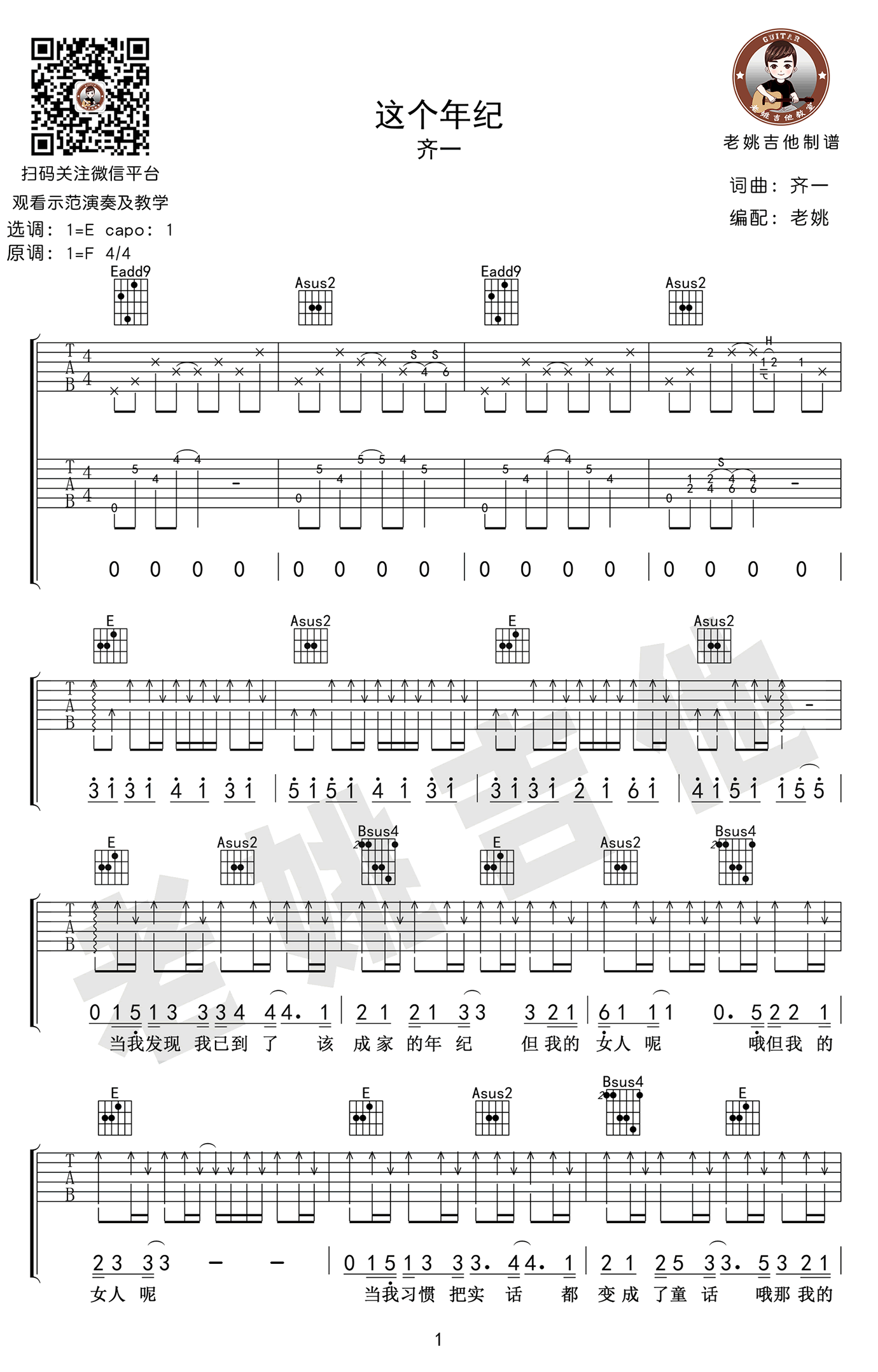 这个年纪吉他谱,齐一原创歌曲,原调F,选用E调,Capo夹一品,《这个年纪》吉他弹唱谱,六线谱高清图片版,感谢老姚吉他的编配和提供教学视频,易唱网推荐分享。