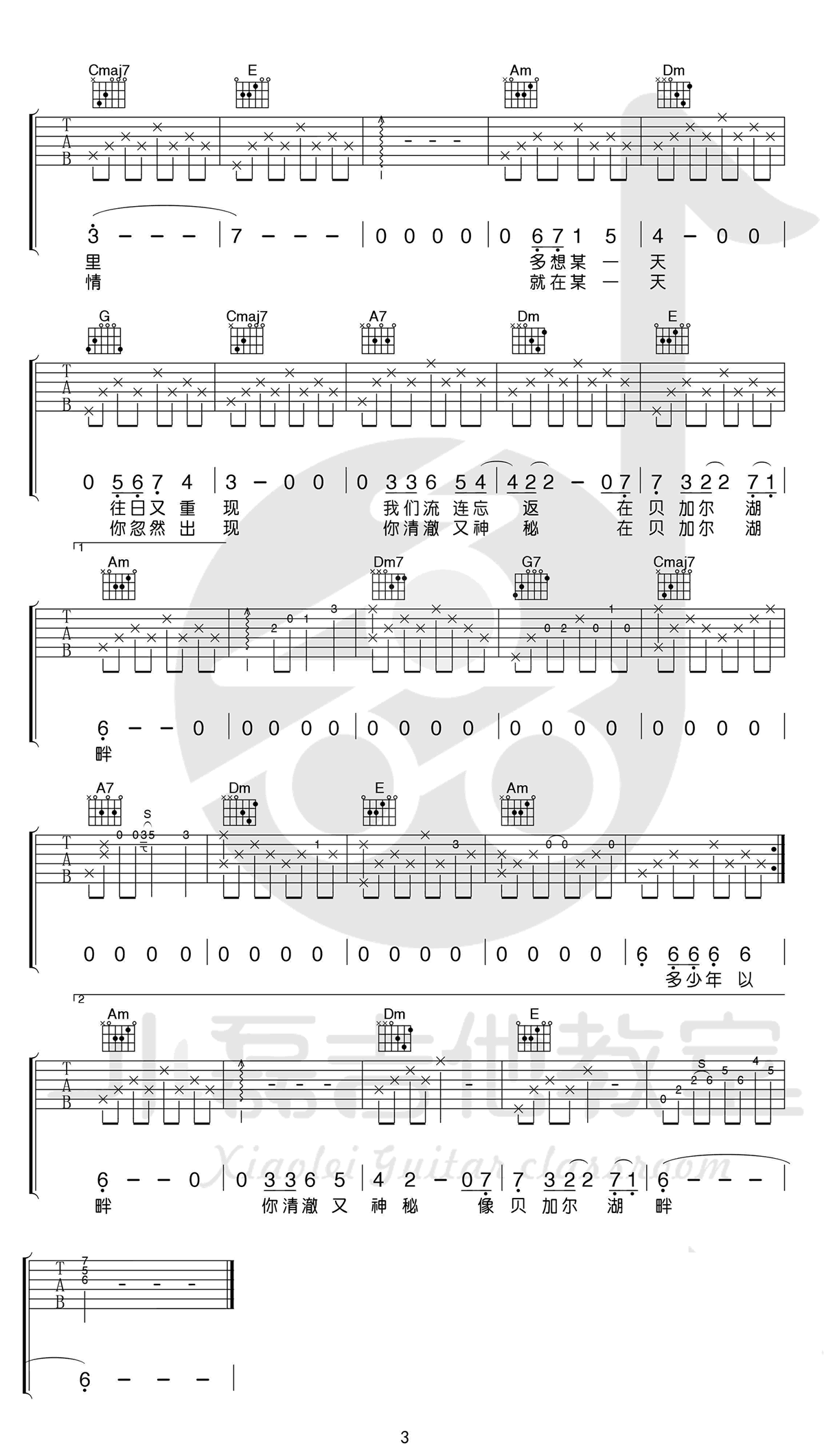 - 贝加尔湖畔吉他谱 C调简单版 高清弹唱六线谱