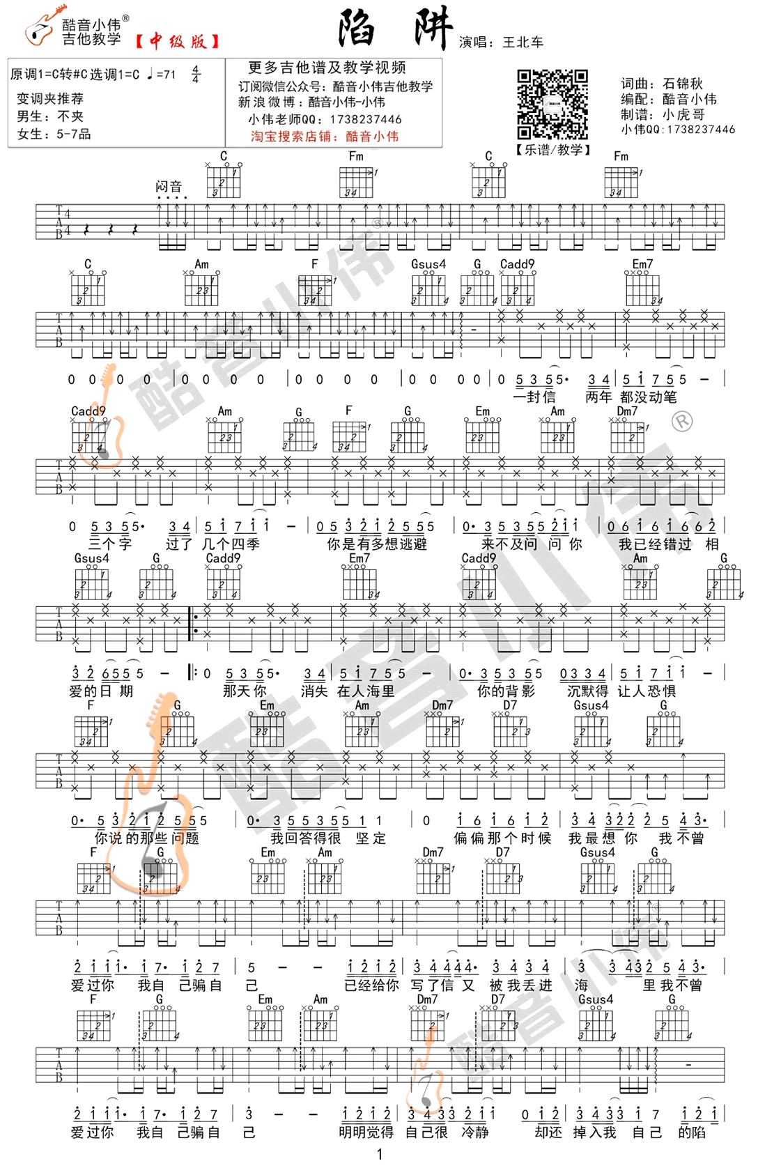陷阱吉他谱,王北车演唱,一首风靡网络的抖音热门歌曲,《陷阱》六线谱,高清弹唱图片谱,原调C转#C,选用C调,男生不夹变调夹,女生变调夹推荐5-7品。感谢酷音小伟的编配和提供的弹唱演示和教学视频,易唱网推荐分享。