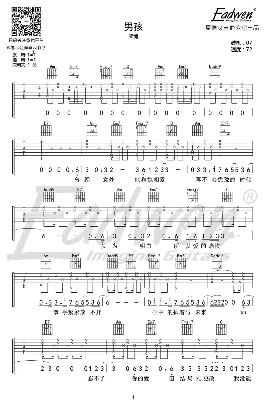 男孩吉他谱,梁博词曲创作并演唱,《男孩》吉他六线谱,原调#C,选用C调,变调夹1品,爱德文吉他编配,并提供吉他教学视频,易唱网推荐分享。