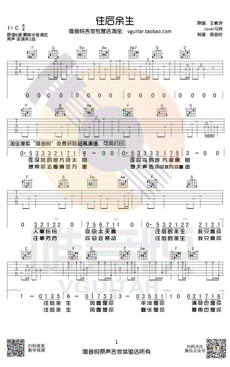 - 往后余生吉他谱 马良 C调弹唱 高清图片谱