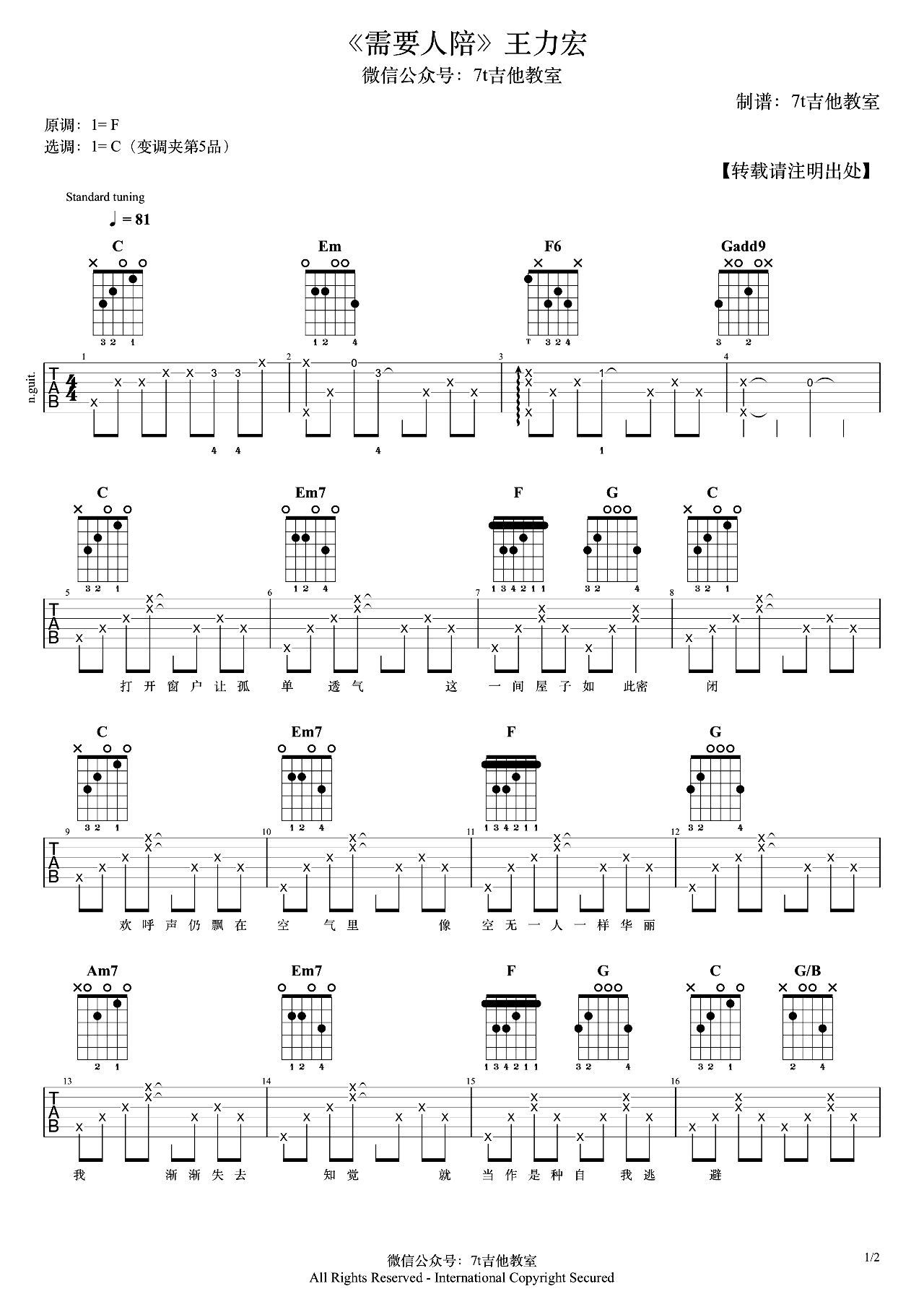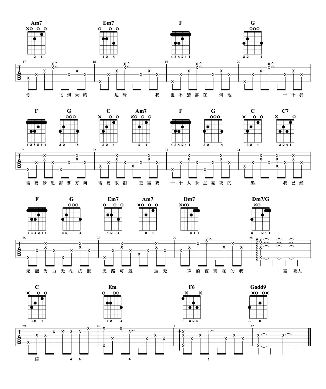 - 需要人陪吉他谱 C调弹唱谱 王力宏《西虹市首富》插曲