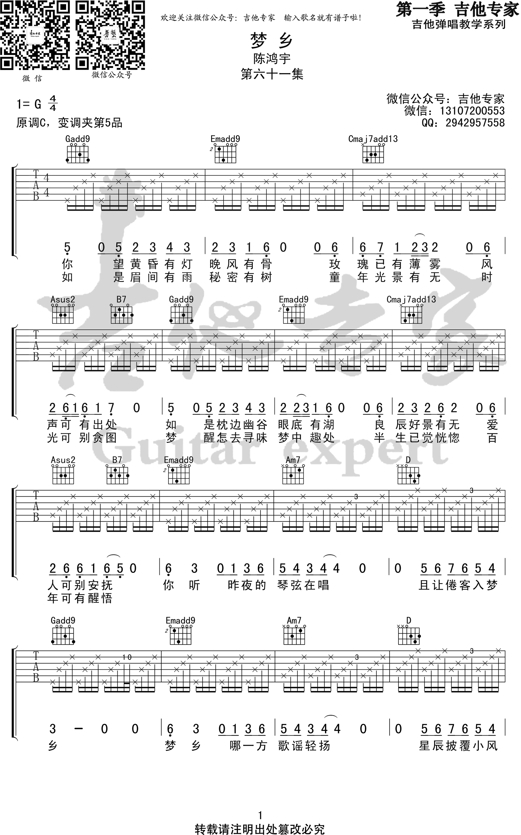 - 梦乡吉他谱_陈鸿宇_G调弹唱谱_高清六线谱