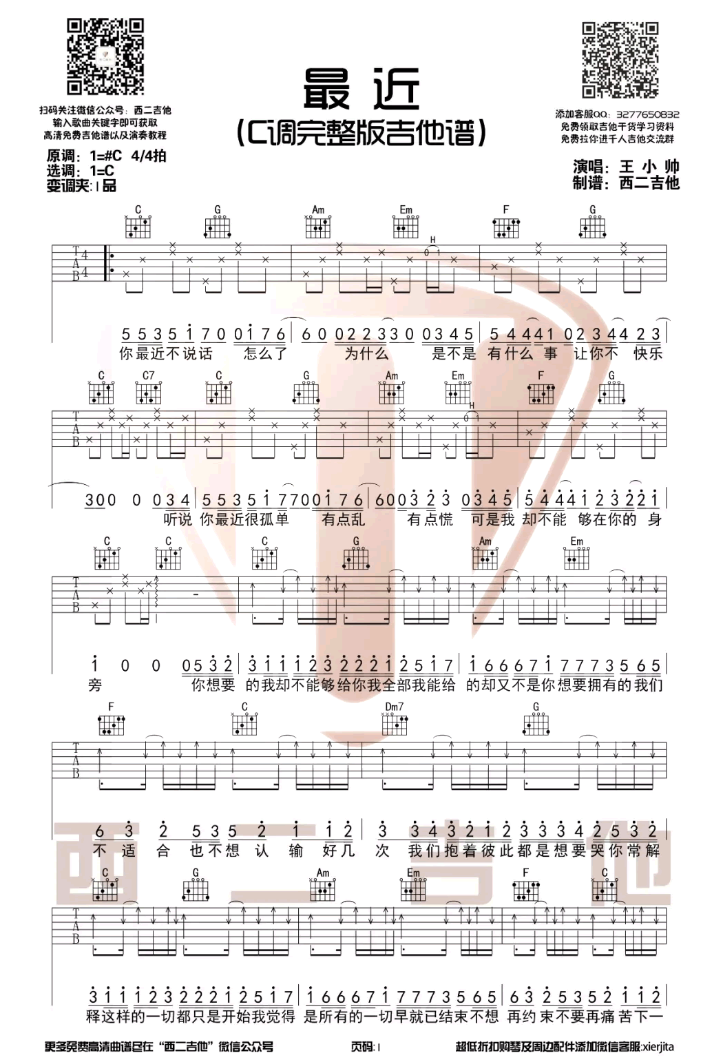 - 王小帅《最近》吉他谱_C调完整版_吉他教学视频