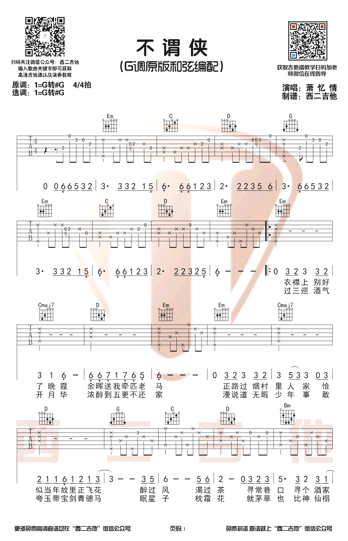 - 不谓侠吉他谱_萧忆情_G调原版_弹唱演示视频