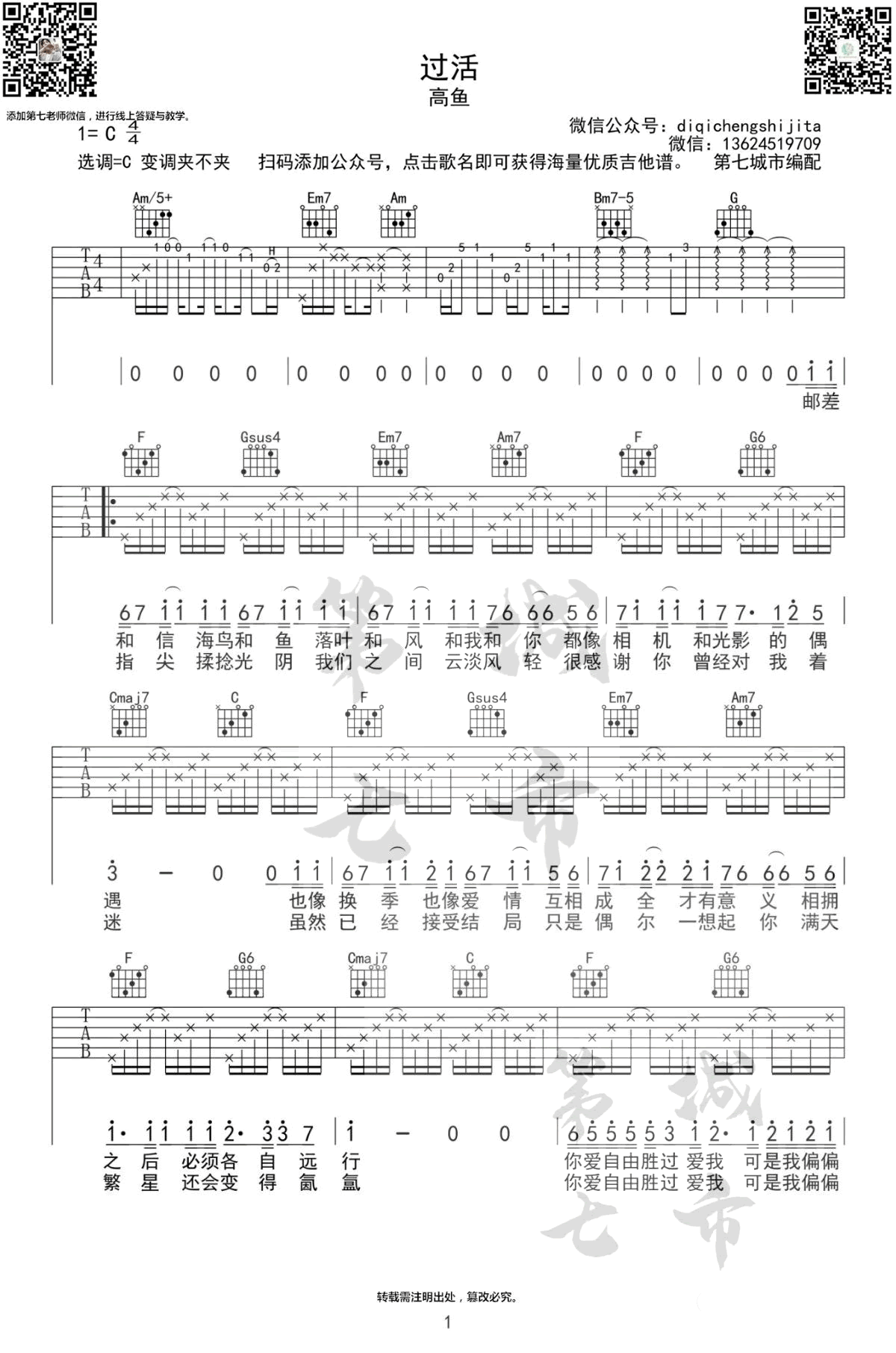 - 过活吉他谱_高鱼_C调弹唱谱_图片谱