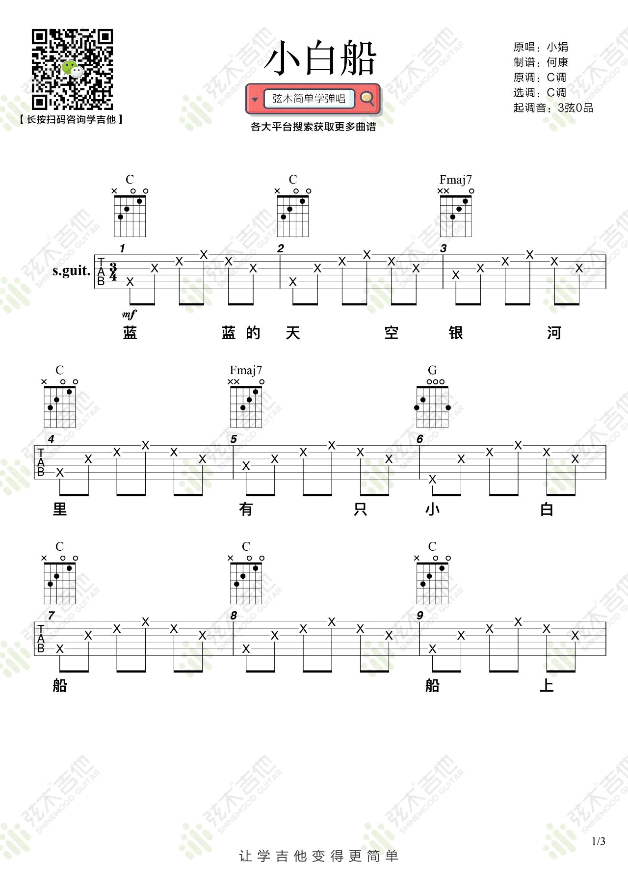 - 小白船吉他谱_儿歌_隐秘的角落BGM_C调弹唱谱