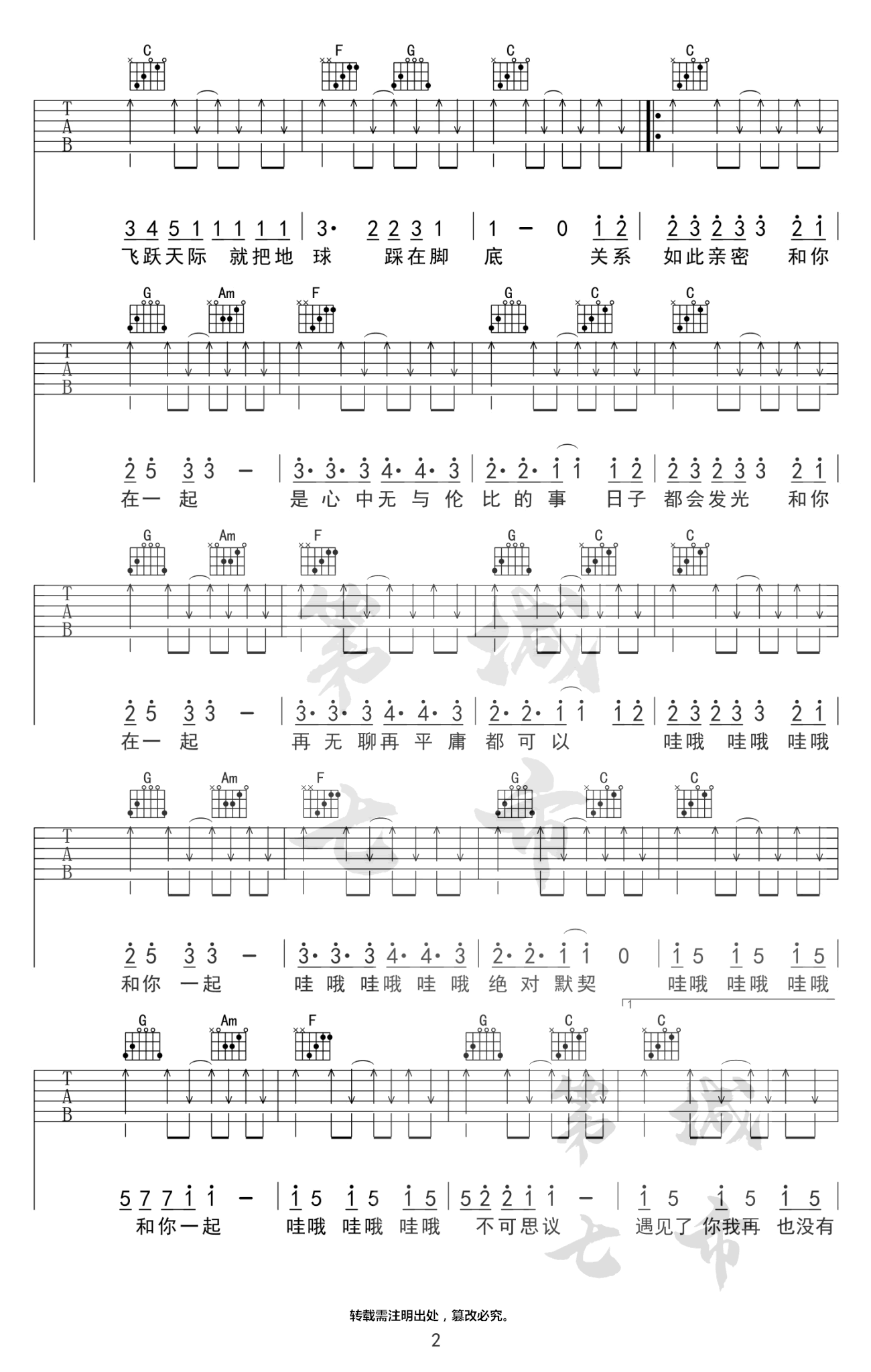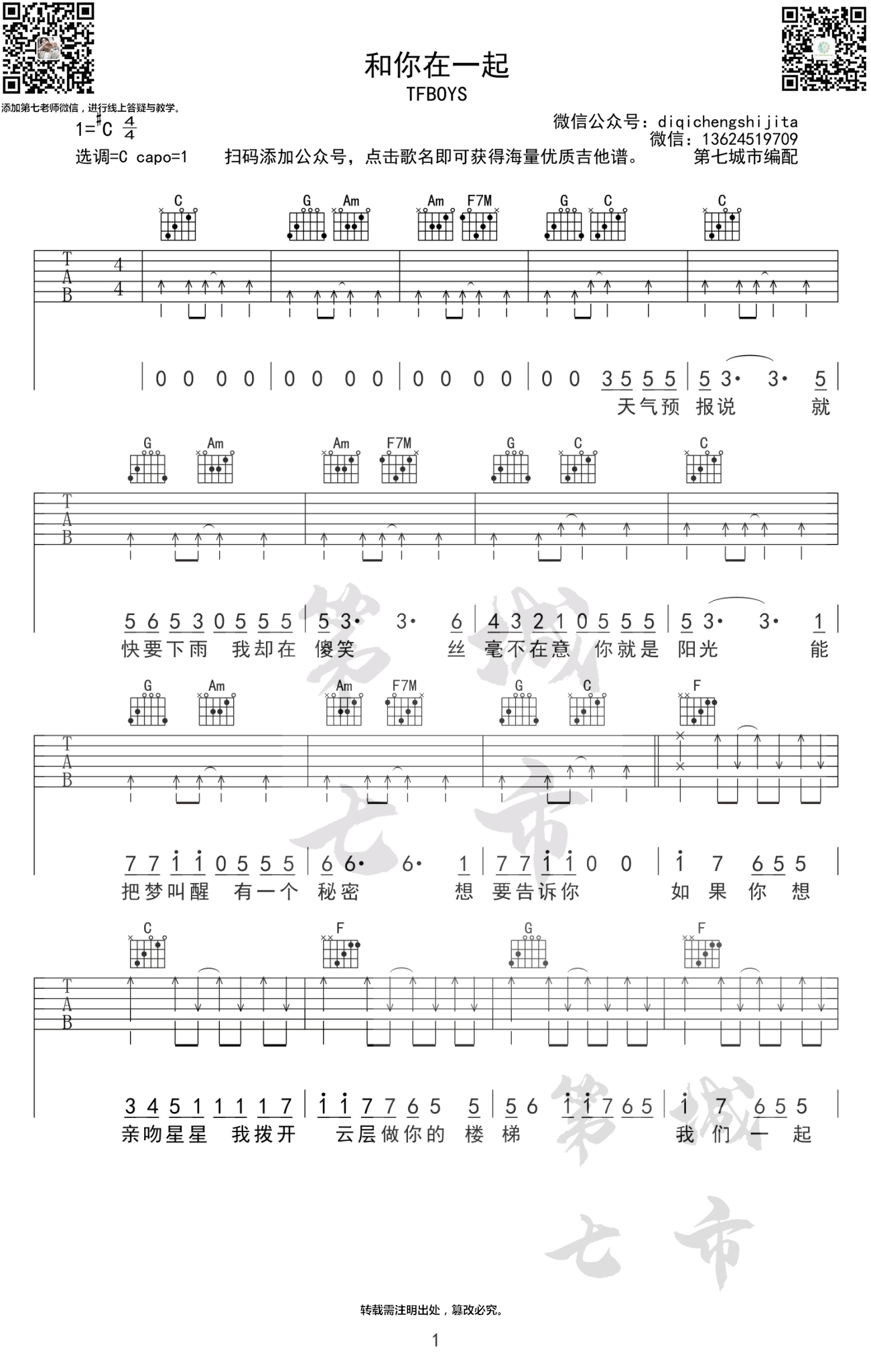- 和你在一起吉他谱_Tfboys_C调_弹唱谱