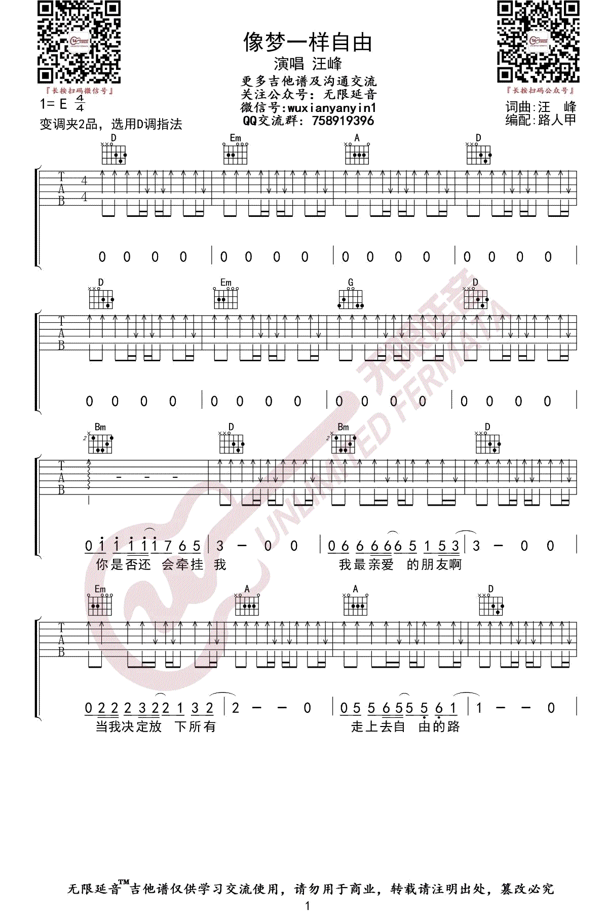 - 像梦一样自由吉他谱_汪峰_E调_弹唱图片谱