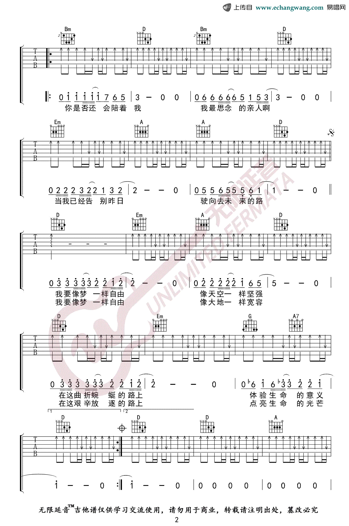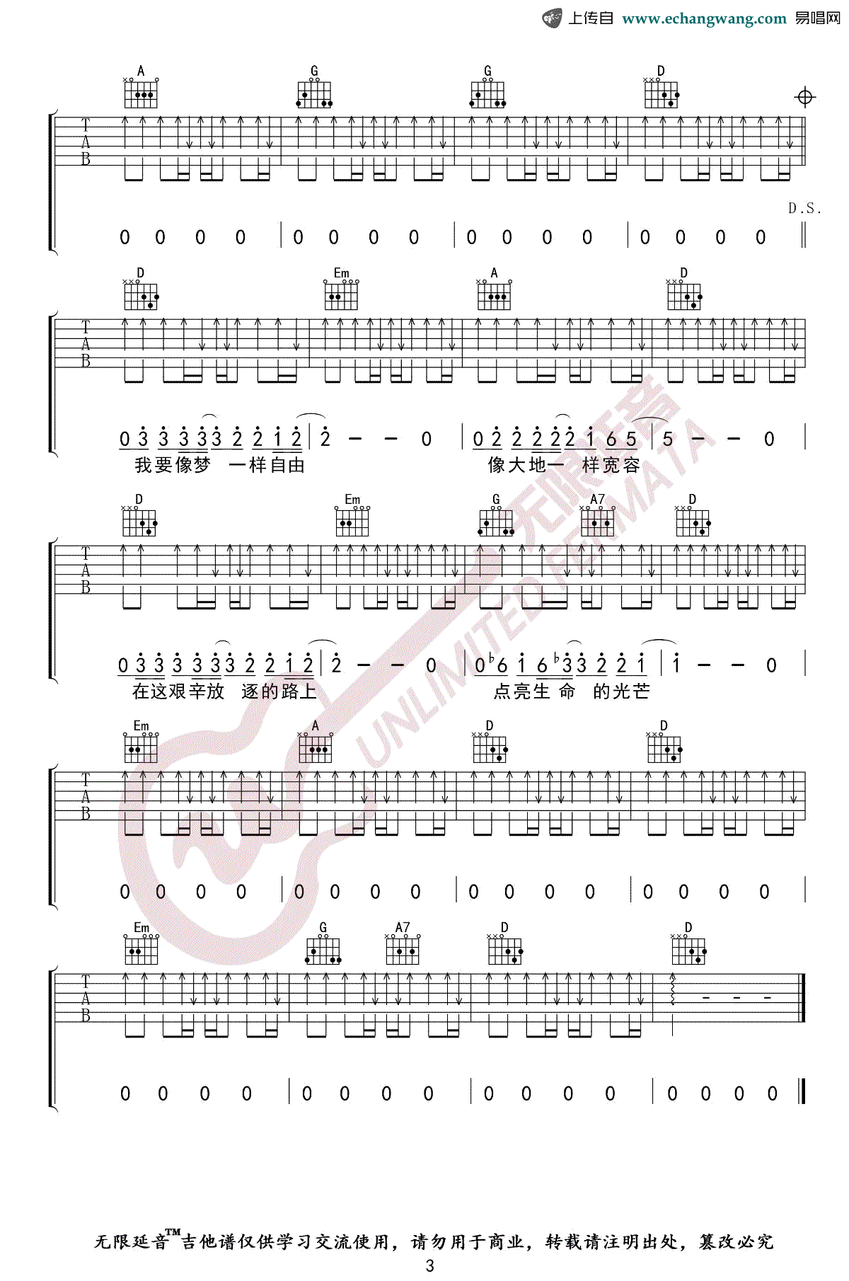 - 像梦一样自由吉他谱_汪峰_D调指法_弹唱谱