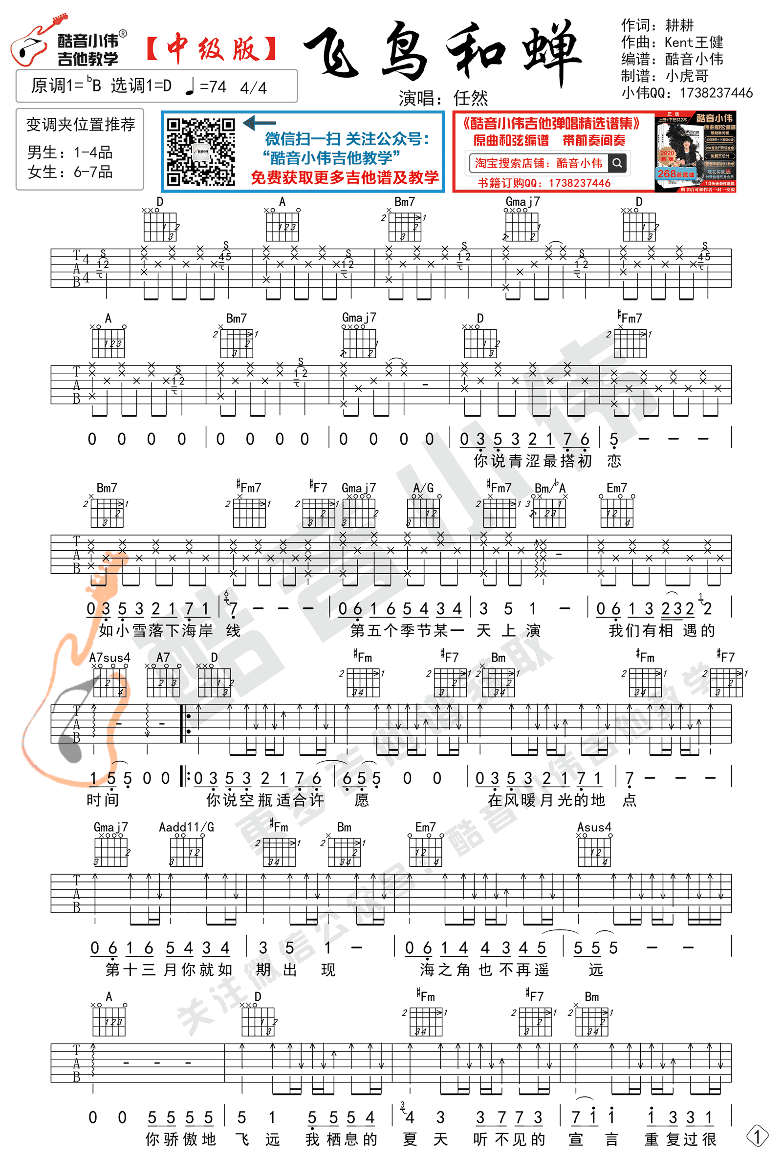 任然《飞鸟和蝉》吉他谱,原调降B成都D,变调夹推荐,男生1-4品,女生6-7品。飞鸟和蝉六线谱,酷音小伟中级版编配,易唱吉他谱网整理上传。