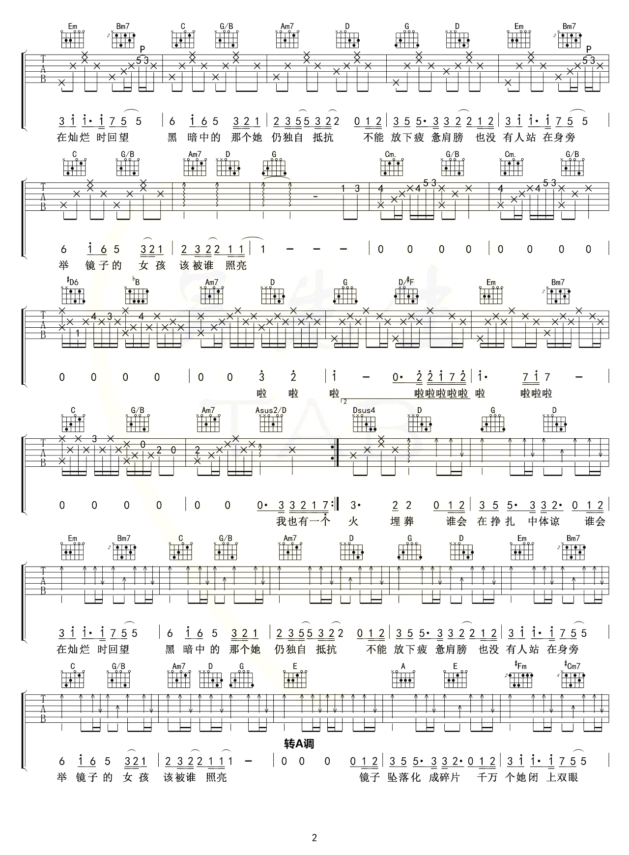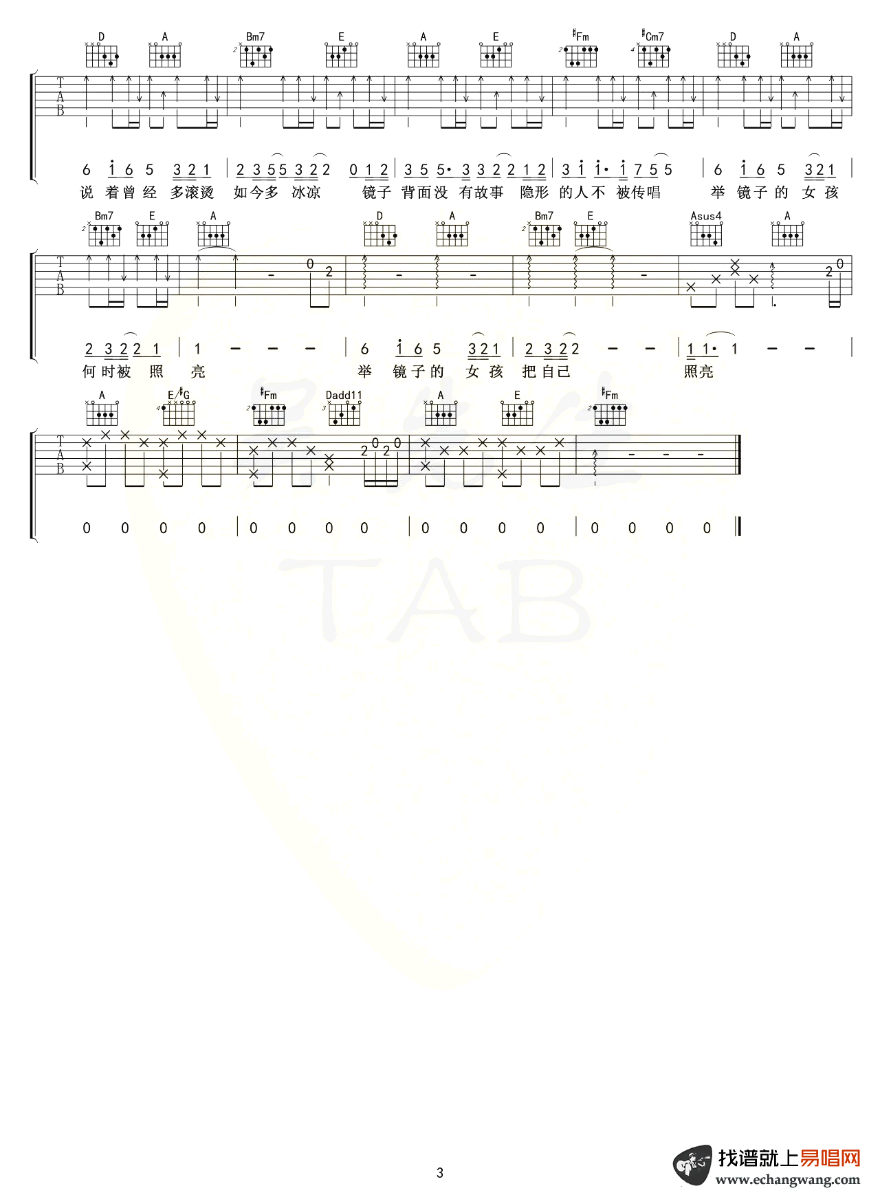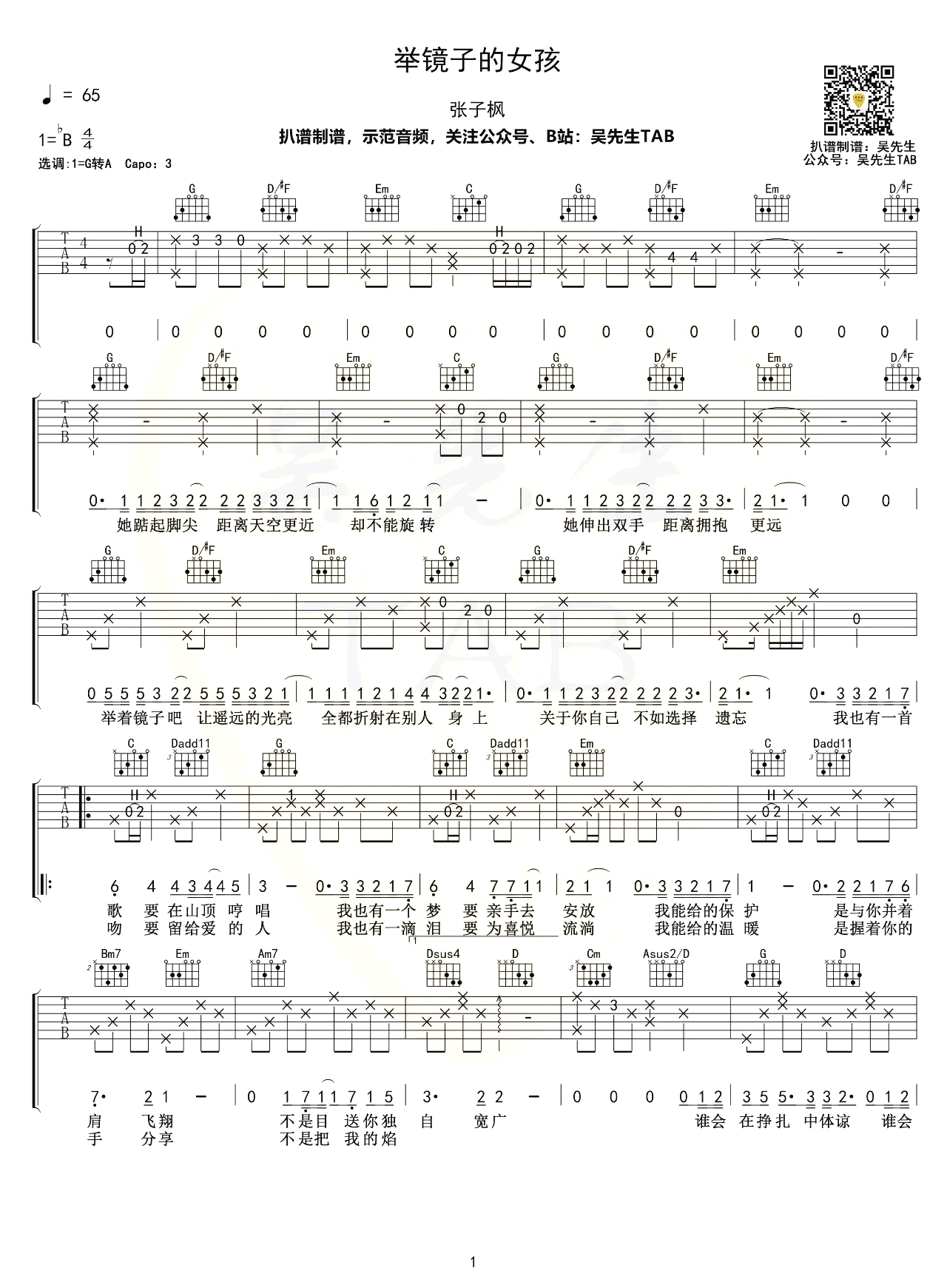 举镜子的女孩吉他谱,张子枫演唱,电影《我的姐姐》的推广曲。举镜子的女孩六线谱,原调降B,选调G转A,CAPO夹三品。三张弹唱图片谱由吴先生TAB编配出品,易唱网更新上传。我也有一个梦,要亲手去安放。我也有一个吻,要留给爱的人。伸出双手,拥抱天空,在暗香浮动的时光里,静静描画着遥远的光亮。黑暗时的挣扎,灿烂时的孤独,小小的身躯,也只能自己默默抵抗。可以忽略,也可以不在乎,却逃不过自己对光的渴望。 生活越来越复杂,情感的浪花在翻腾,氤氲在你我之间的情愫, 竟让人进退维谷。