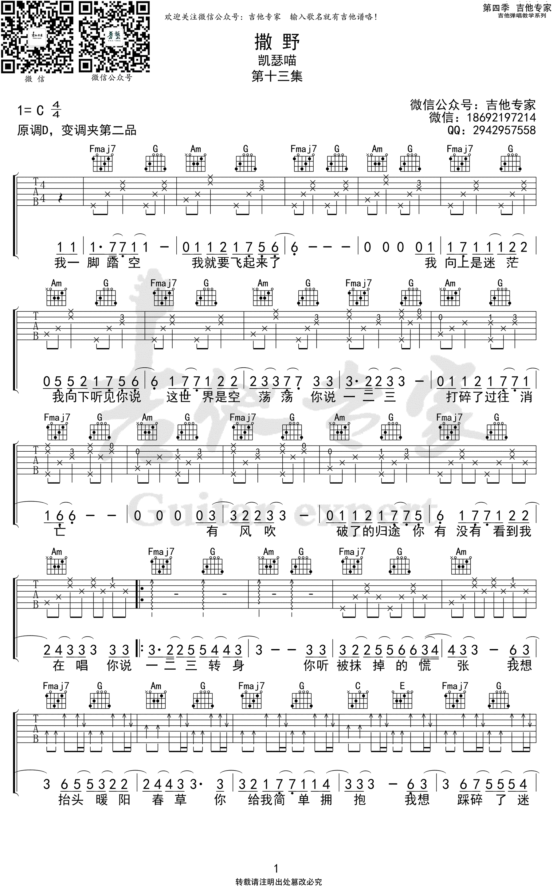 - 撒野吉他谱_凯瑟喵_巫哲小说《撒野》C调弹唱谱