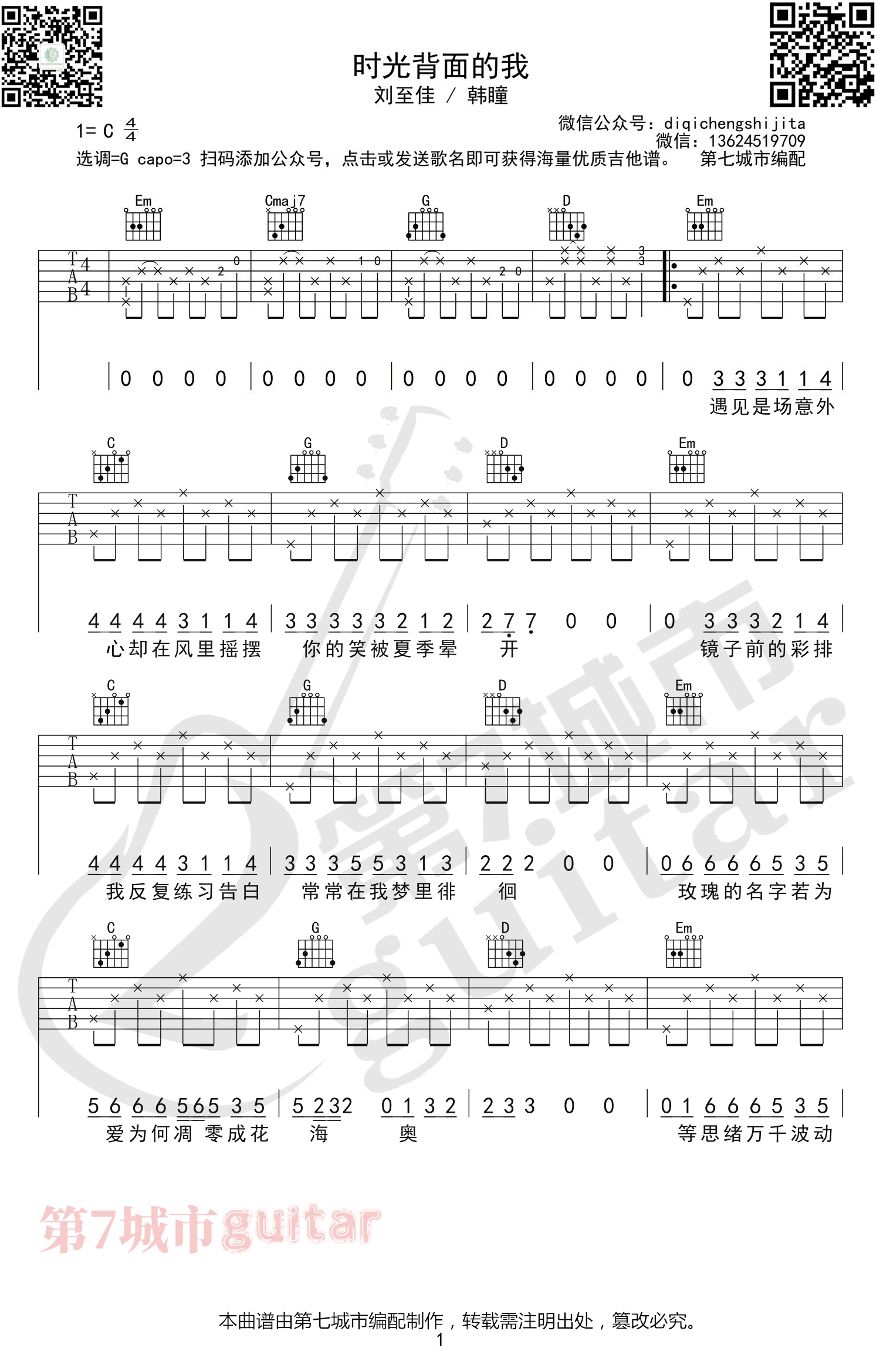 - 时光背面的我吉他谱_刘至佳/韩瞳_G调弹唱谱
