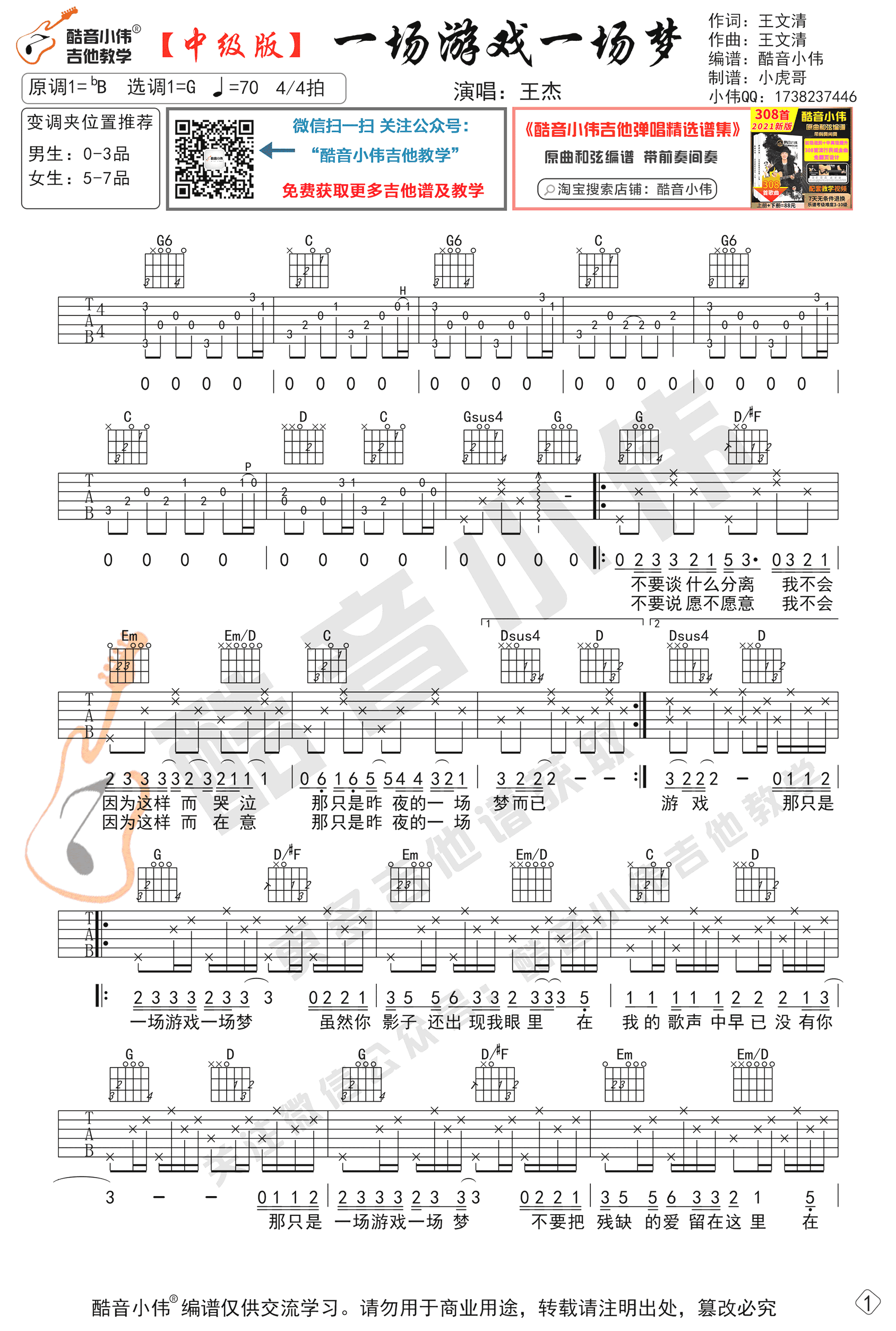 - 一场游戏一场梦吉他谱_王杰_G调中级版_弹唱教学视频