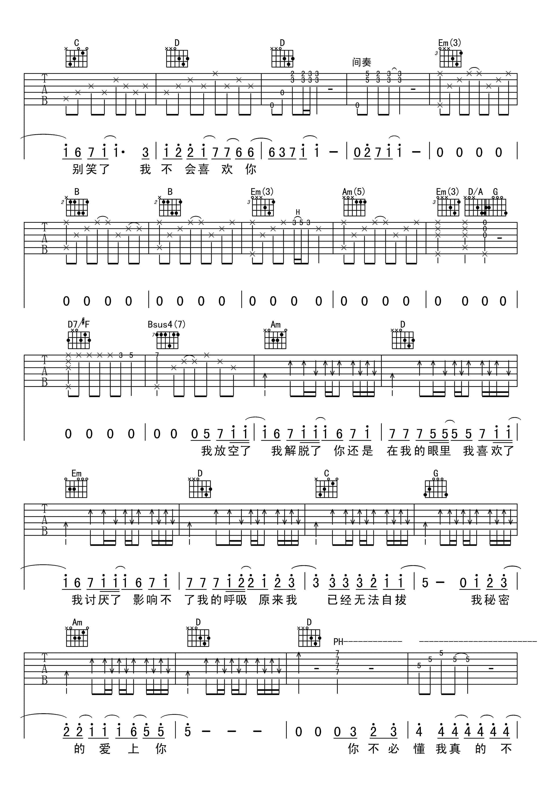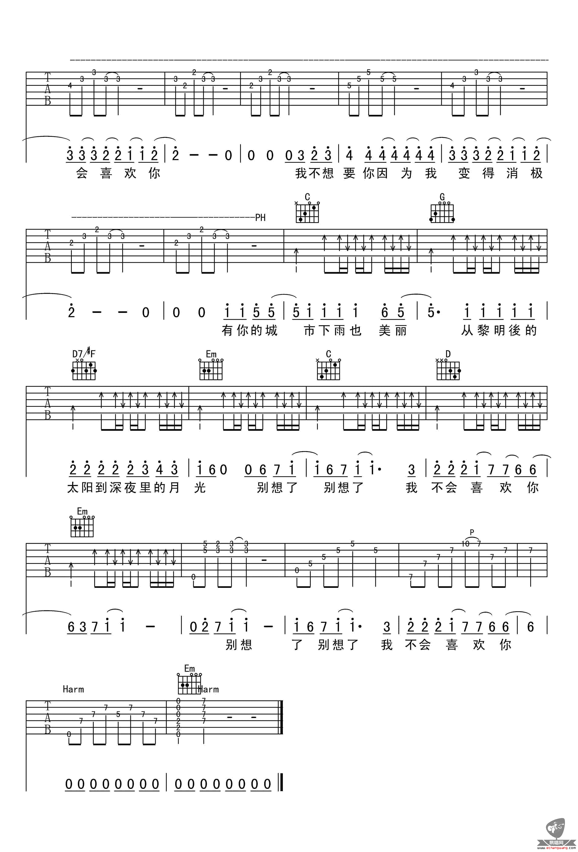 陈柏霖我不会喜欢你吉他谱 我想我应该应该不会爱你 为了要努力 努力的不爱你 所以我让自己那麽喜欢你 这样你就不忍心和我分离 我想我讨厌 讨厌骄傲的你 也讨厌美好 美好的那个你 於是我要自己假装讨厌你 那麽你就舍不得离我而去 我必须说我真的不会喜欢你 我不喜欢你占据我所有思绪 连你的窃笑也像是鼓励 从早安後的早餐到晚餐後的晚安 别笑了 别笑了 我不会喜欢你 我放空了 我解脱了 你还是在我的眼里 我喜欢了 我讨厌了 影响不了我的呼吸 原来我 已经无法自拔 我秘密的 爱上你 你不必懂 我真的不会喜欢你 我不想要你因为我变得消极 有你的城市下雨也美丽 从黎明後的太阳 到深夜里的月光 别想了 别想了 我不会喜欢你