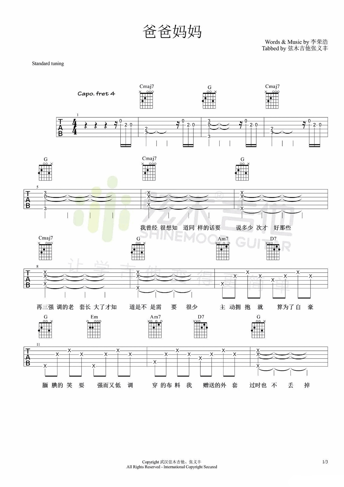 - 爸爸妈妈吉他谱 李荣浩 弹唱谱六线谱