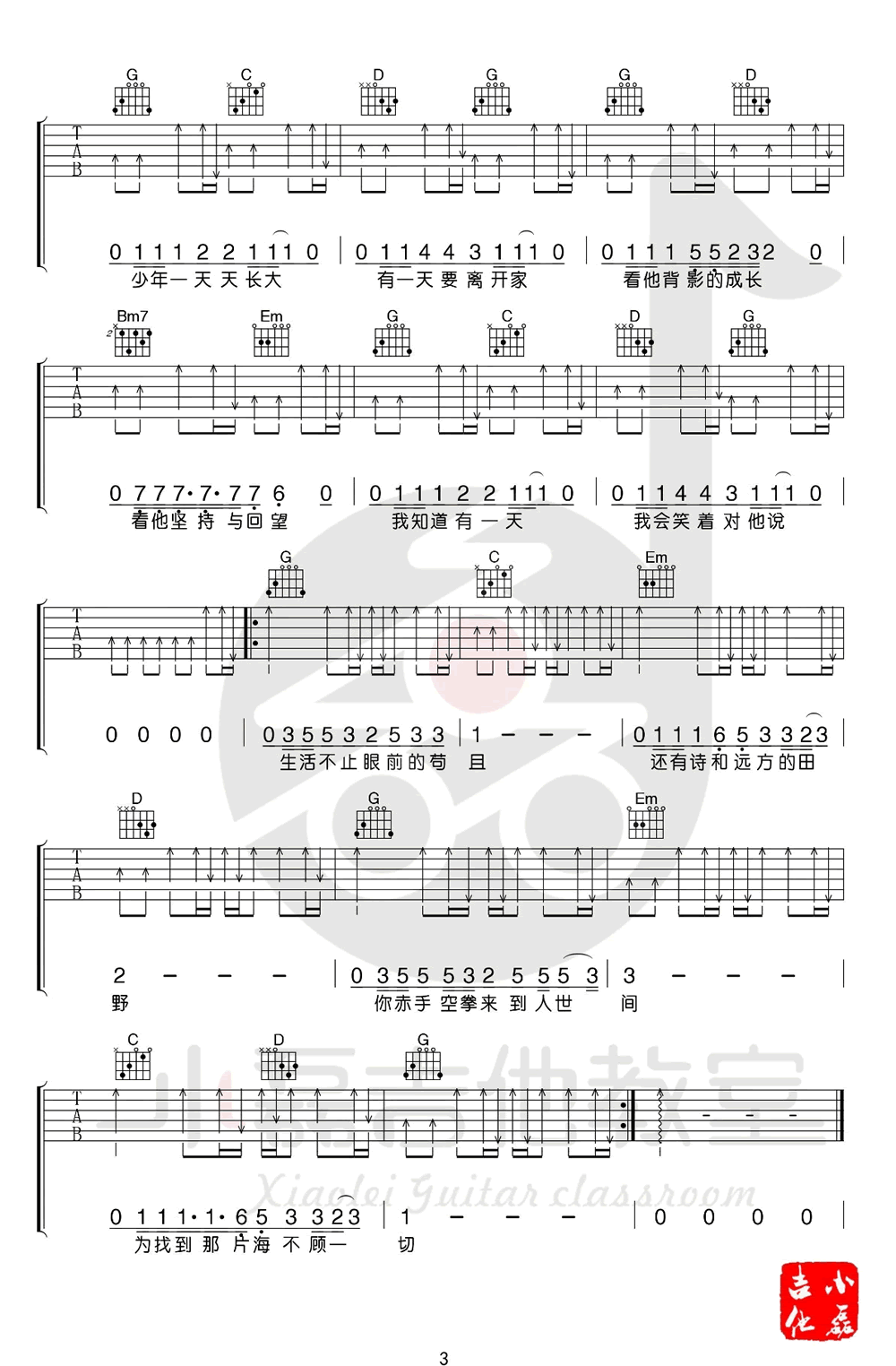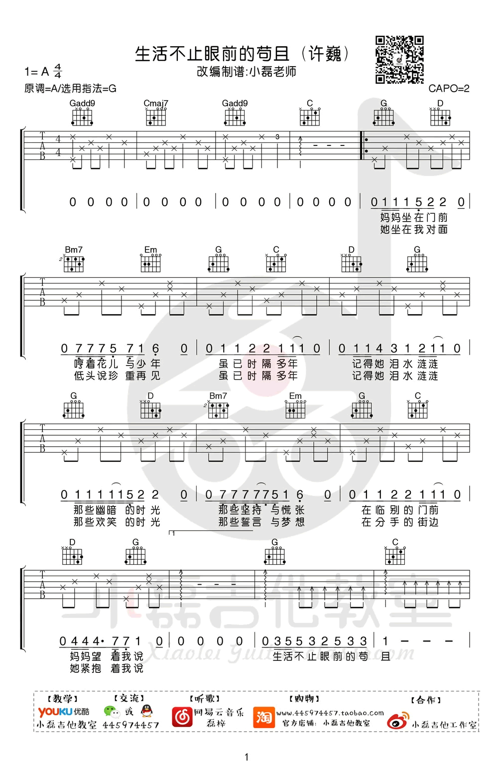 生活不止眼前的苟且吉他谱,许巍演唱,G调指法弹唱谱,CAPO2品,三张图片谱。生活不止眼前的苟且六线谱,小磊吉他编配,易唱网上传推荐。又到了最新视频教学更新的时间了,这一次老师为大家带来这首许巍的比较新的歌,也是非常富有诗意的一首,由才子矮大紧词曲制作。这首歌曲编排比较简单,整体难度不大,非常适合大部分吉他爱好者来演奏弹唱。