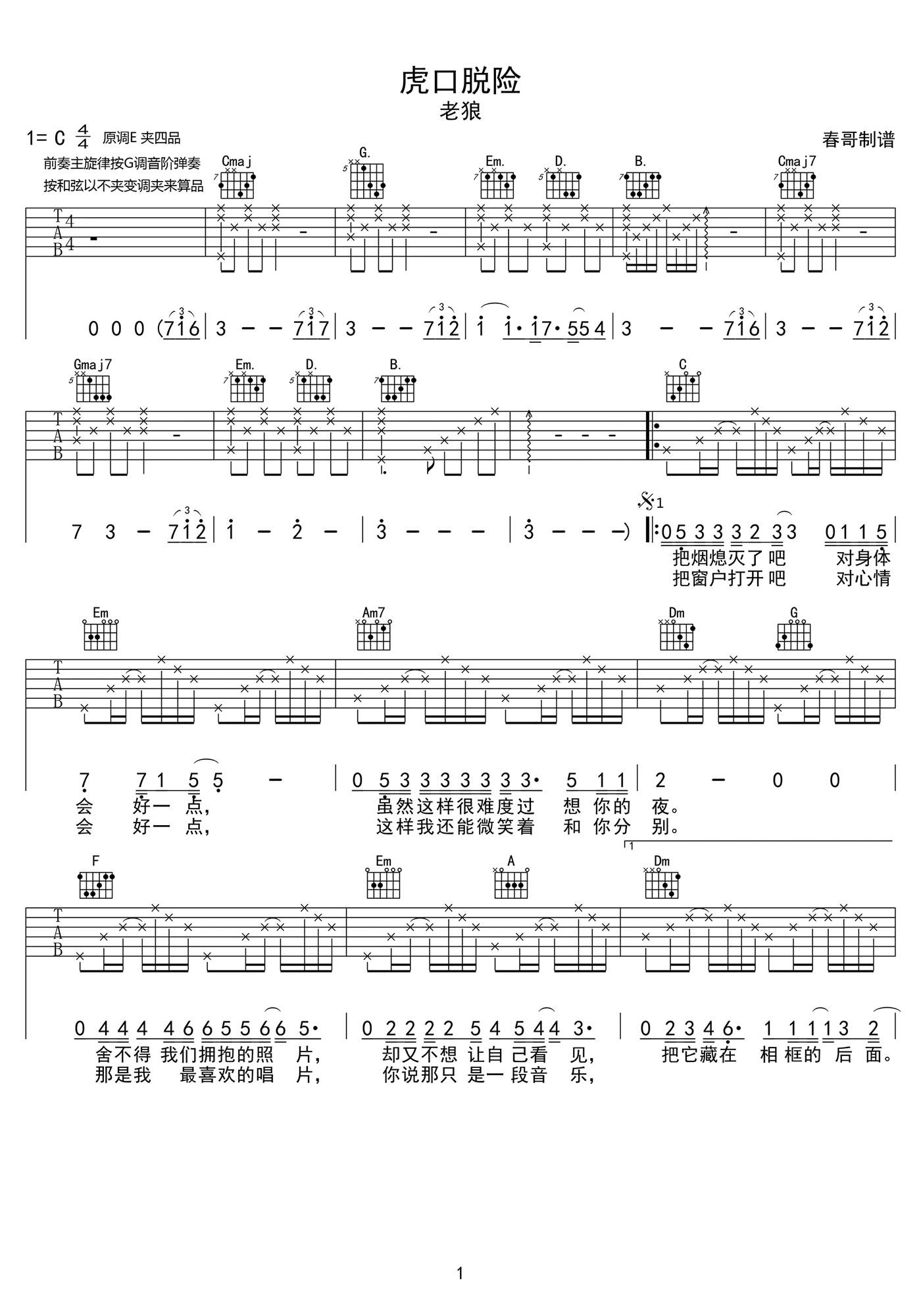 - 虎口脱险吉他谱_C调简单版_老狼_弹唱谱高清版