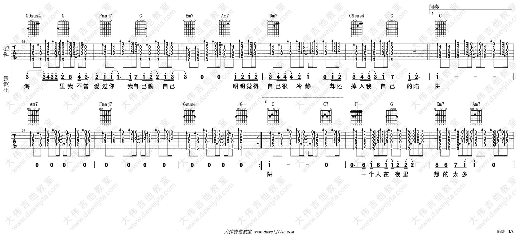 陷阱吉他谱,王北车演唱的一首热门网络歌曲,男生调曲谱,C调原调音高编配,陷阱六线谱,四张高清图片谱,同学们可以点击图片谱看大图浏览,感谢大伟吉他编配,并分享歌曲的吉他弹唱示范视频,易唱网上传推荐。爱情,就是万花筒般的陷阱,五彩斑斓魂牵梦萦,无论里面是什么,都心甘情愿让你深陷其中。一首王北车原创歌曲带给琴友们。