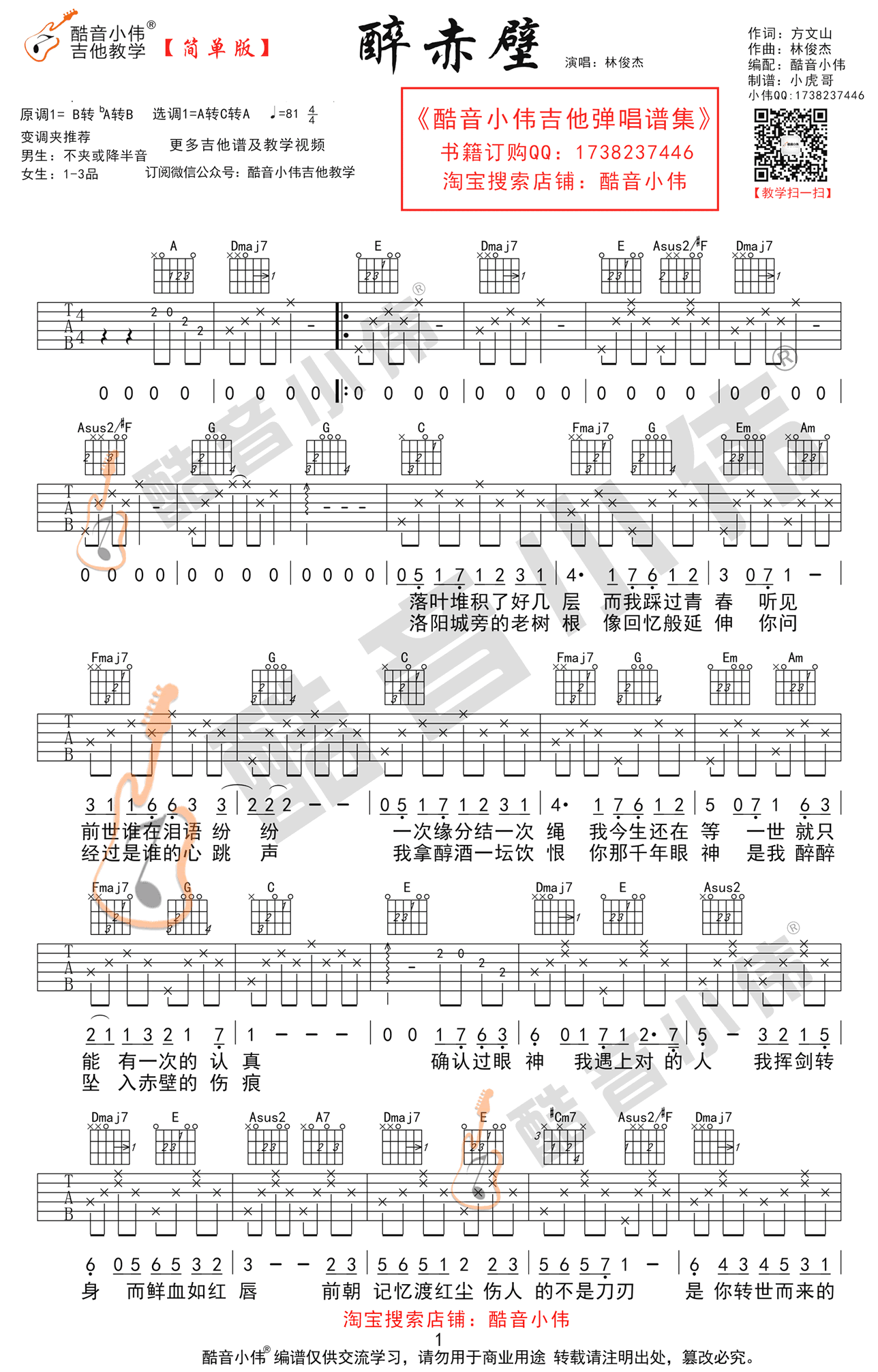 - 醉赤壁吉他谱 林俊杰 弹唱谱 《醉赤壁》吉他教学视频