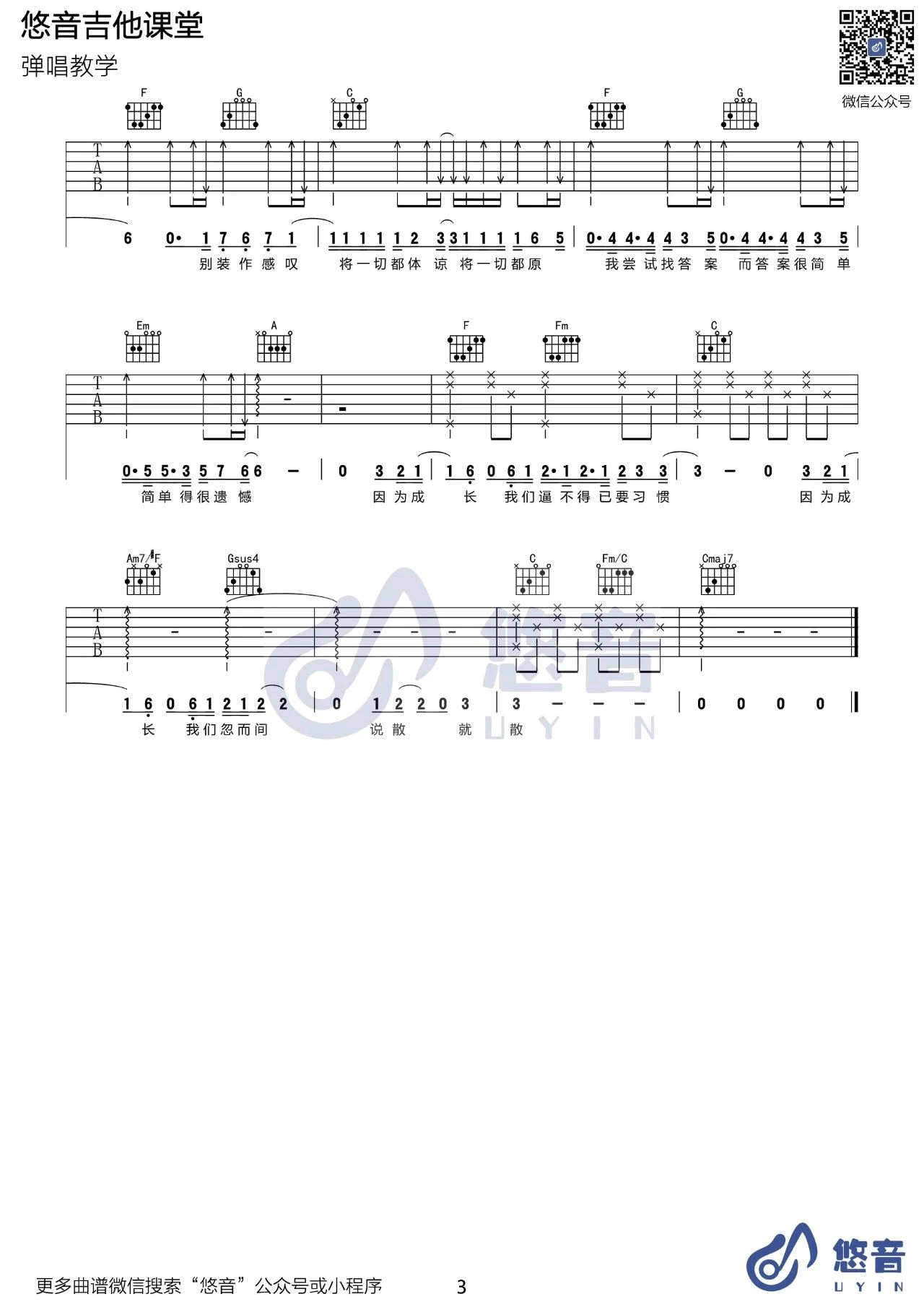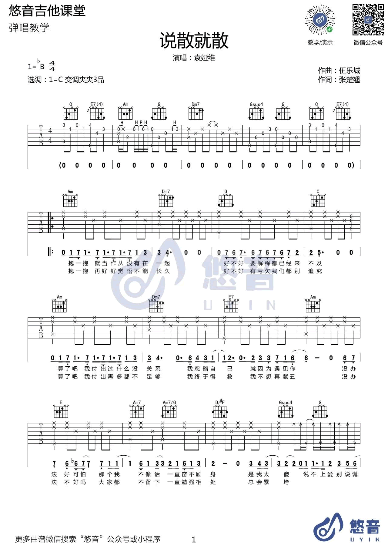 - 说散就散吉他谱 C调 六线谱高清版 弹唱视频演示