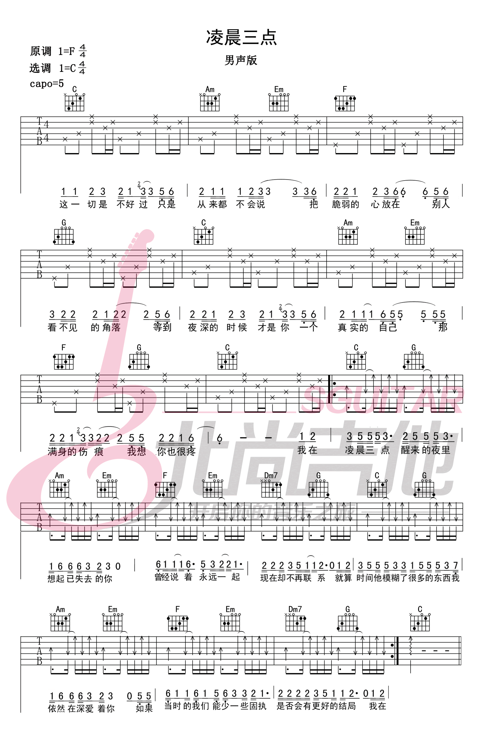 - 凌晨三点吉他谱 陈硕子 C调弹唱谱 副歌六线谱
