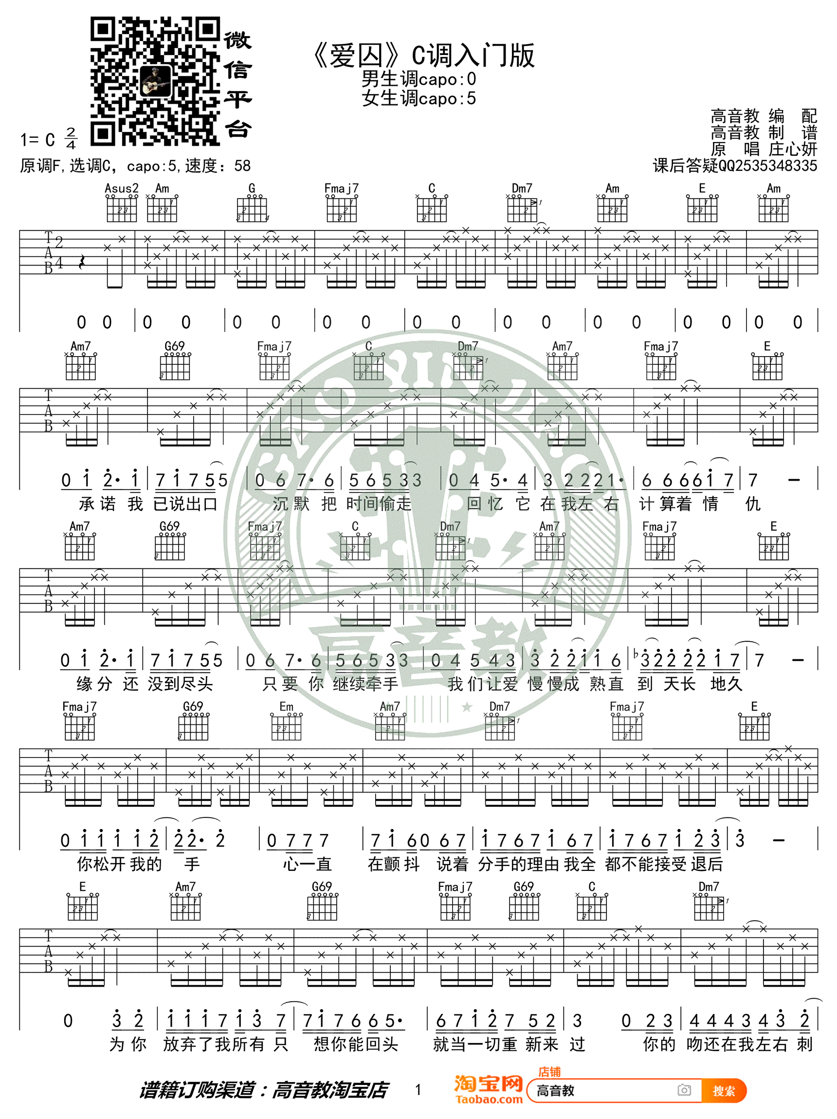 - 爱囚吉他谱_庄心妍_C调入门版_弹唱谱