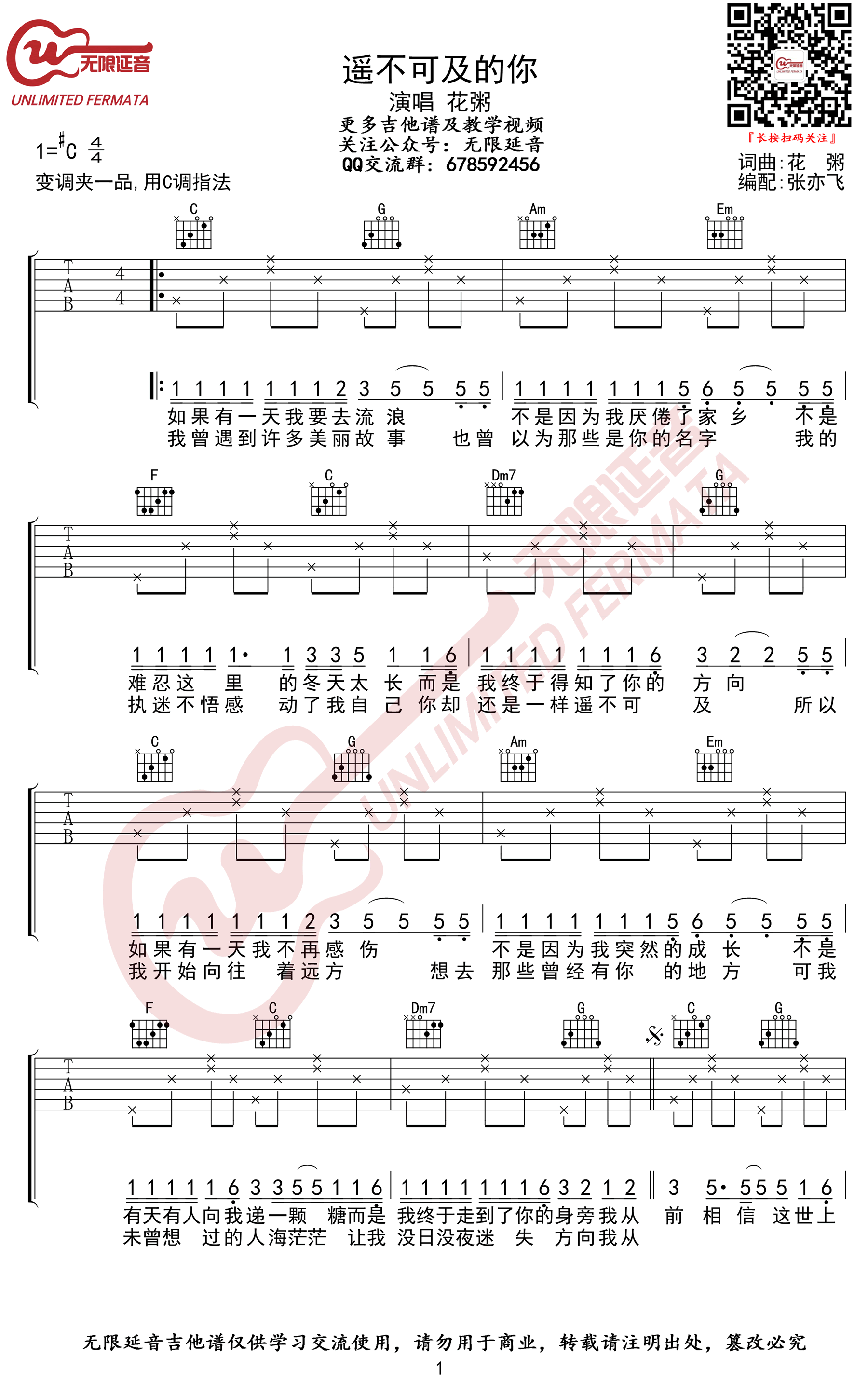 - 遥不可及的你吉他谱_花粥_C调_弹唱六线谱