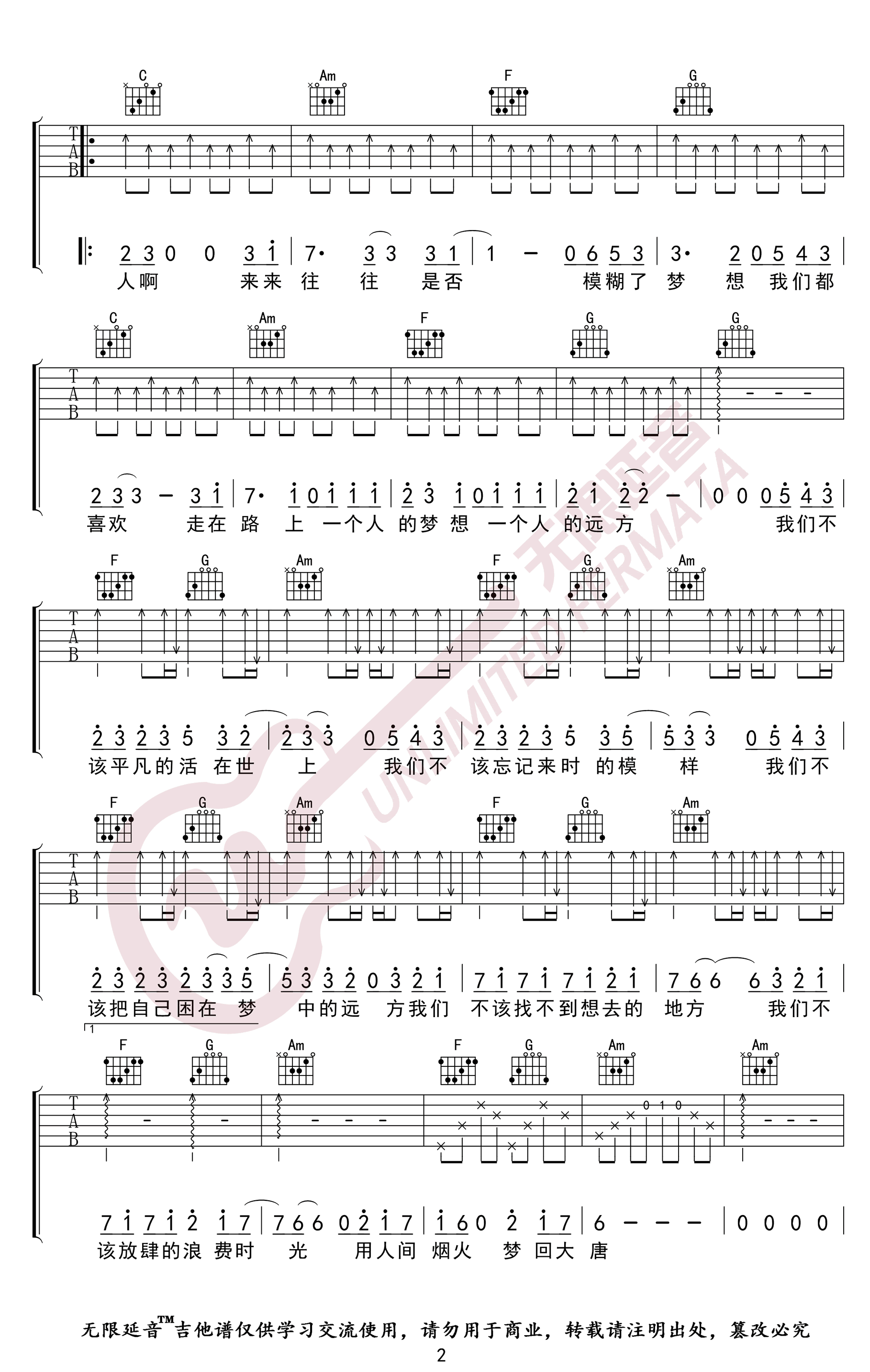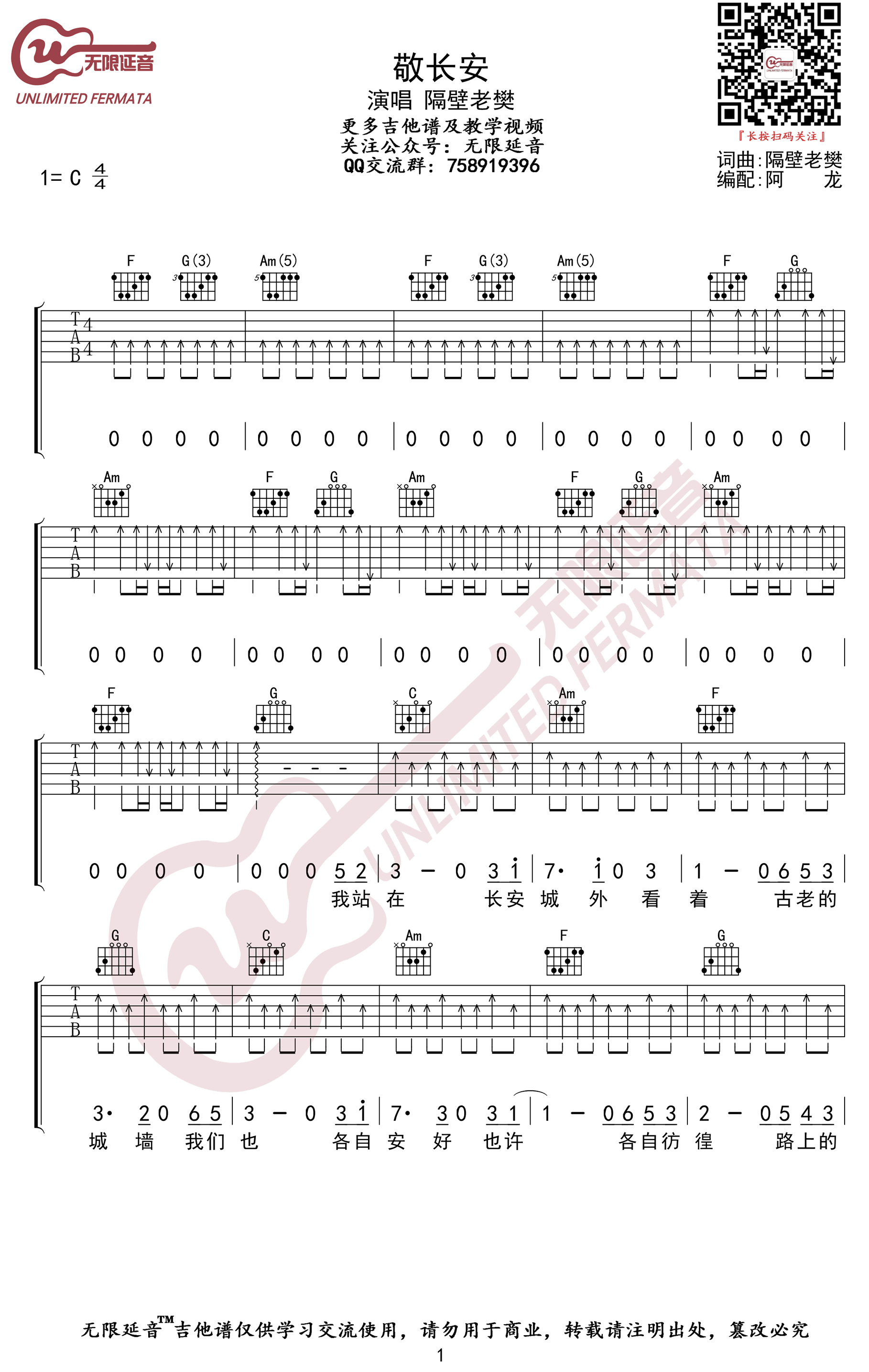 - 敬长安吉他谱_隔壁老樊_C调_弹唱六线谱_高清版