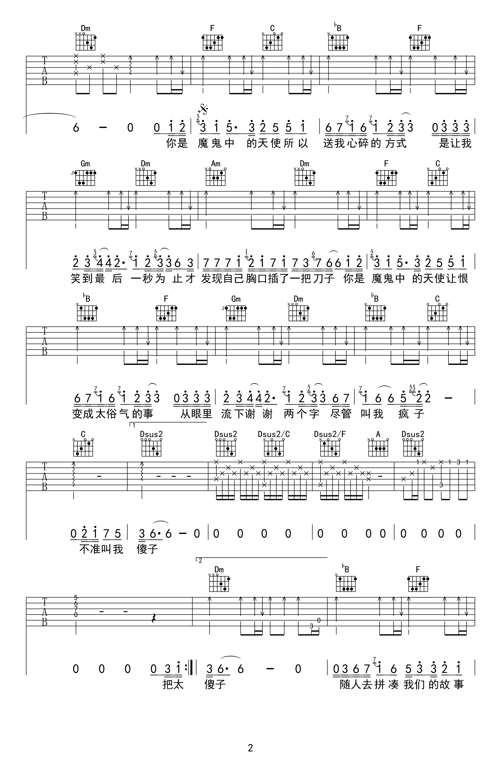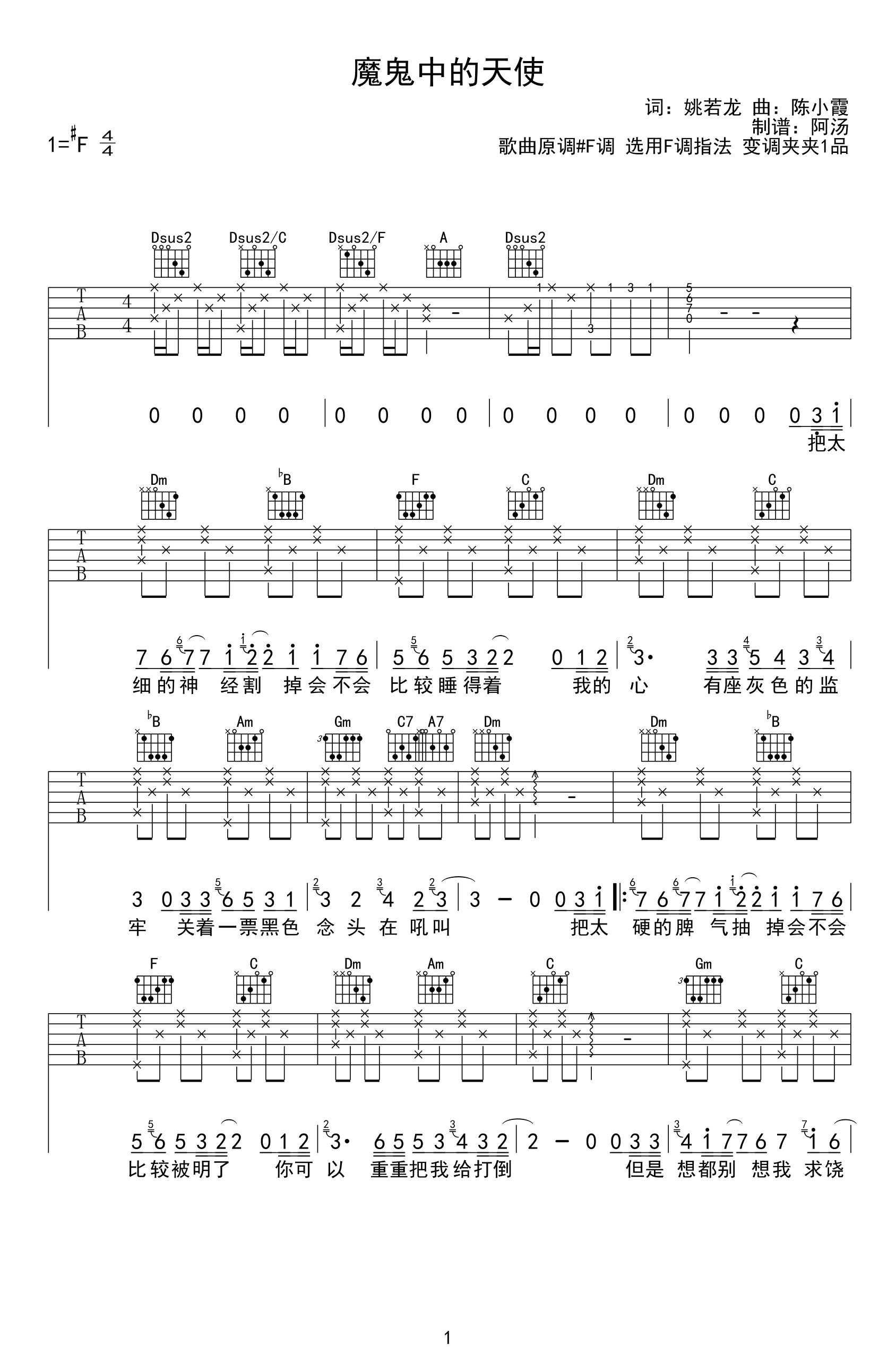 - 魔鬼中的天使吉他谱_田馥甄_F调中级版_弹唱谱