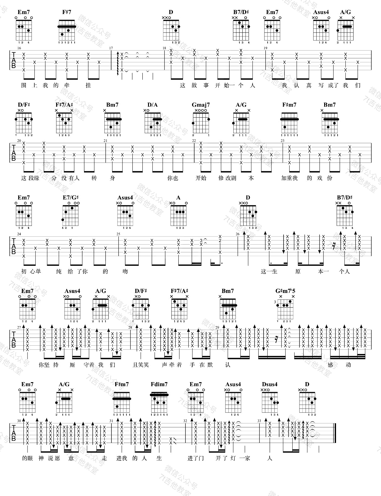 林俊杰《将故事写成我们》吉他谱,这首歌的原调是G#调,这里用的是D调的指法来编配。将故事写成我们六线谱,感谢7t吉他教室出品,并为琴友们带来配套弹唱演示视频,易唱网上传分享。