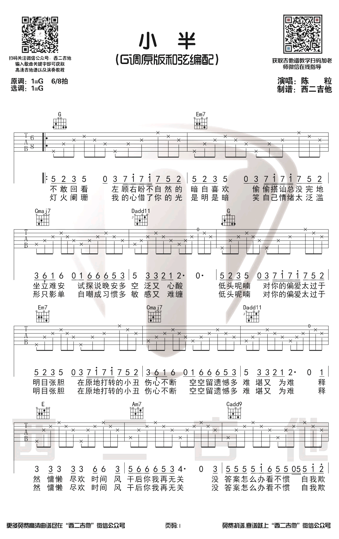 - 陈粒《小半》吉他谱_G调原版_弹唱演示视频