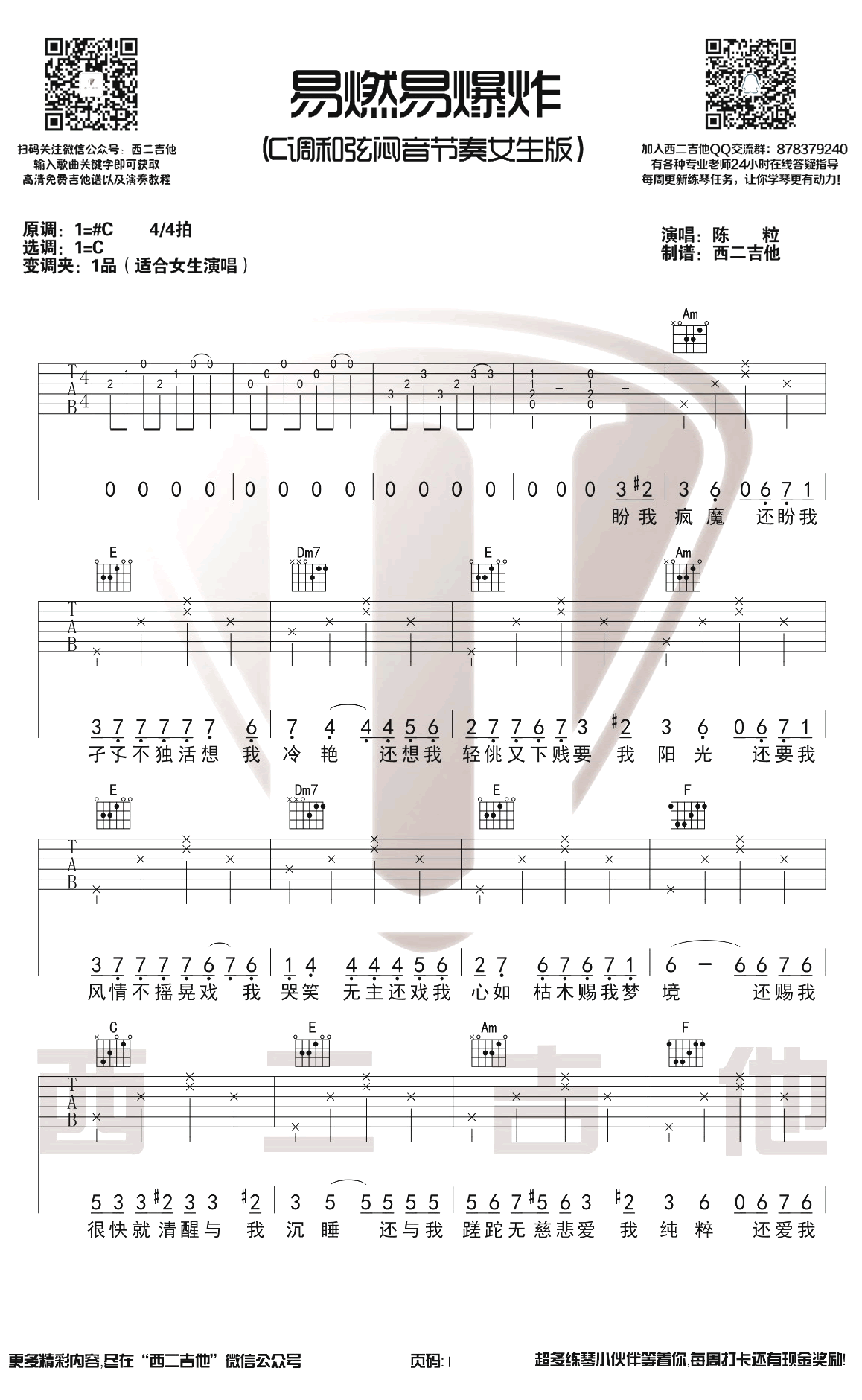 《易燃易爆炸》吉他谱,陈粒很经典的一首没有歌曲,易燃易爆炸六线谱,C和弦闷音节奏女生版,西二吉他编配,易唱网更新上传。