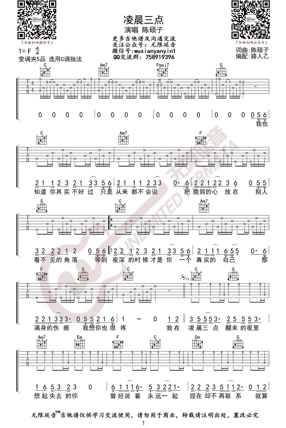 - 凌晨三点吉他谱_陈硕子_C调指法_弹唱谱