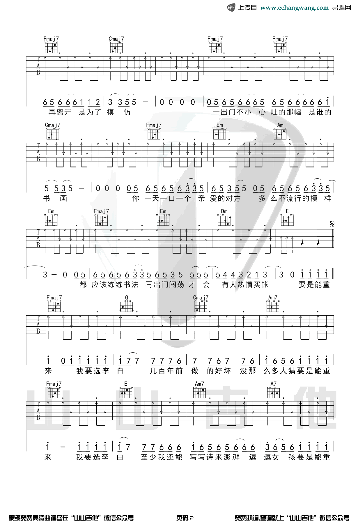 - 李荣浩《李白》吉他谱_C调带间奏_弹唱六线谱