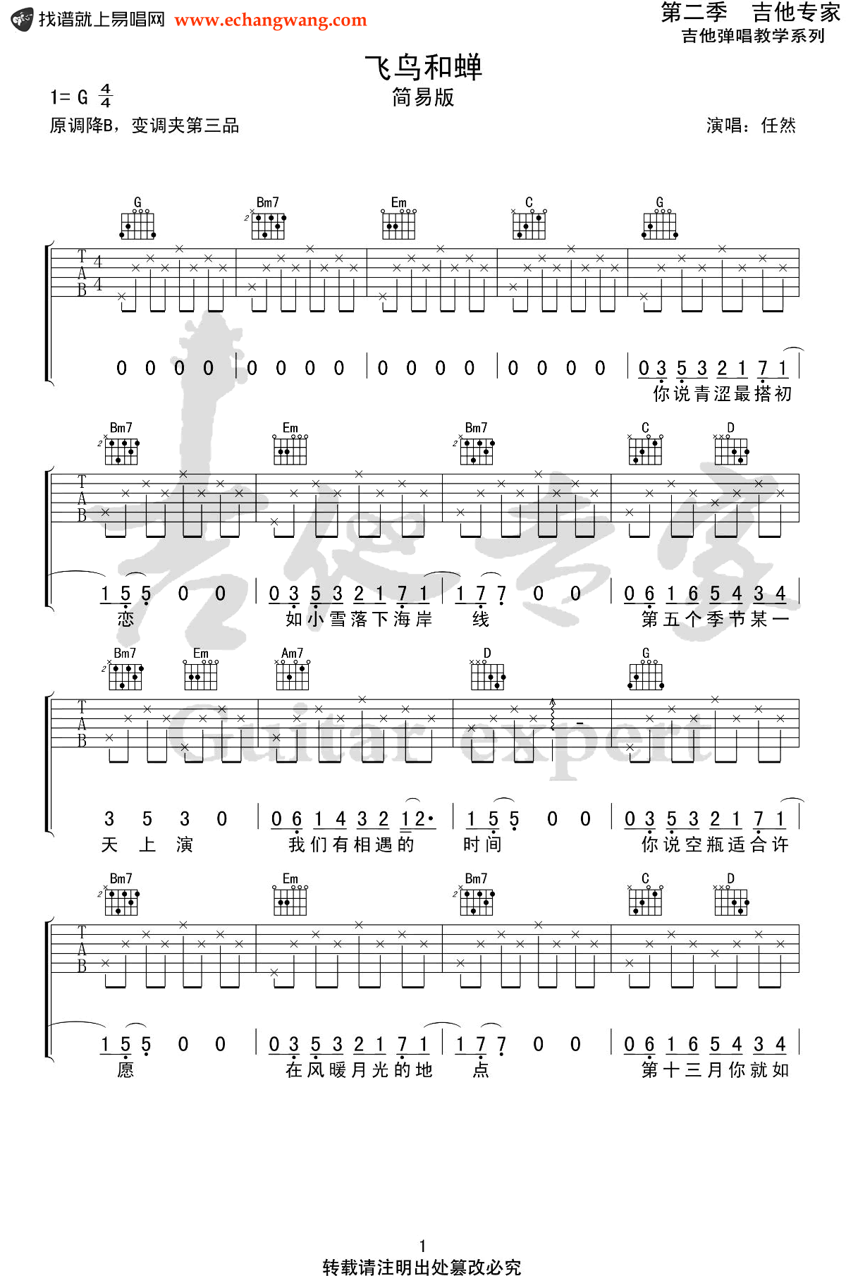 - 飞鸟和蝉吉他谱_C调简单版_任然_弹唱伴奏谱