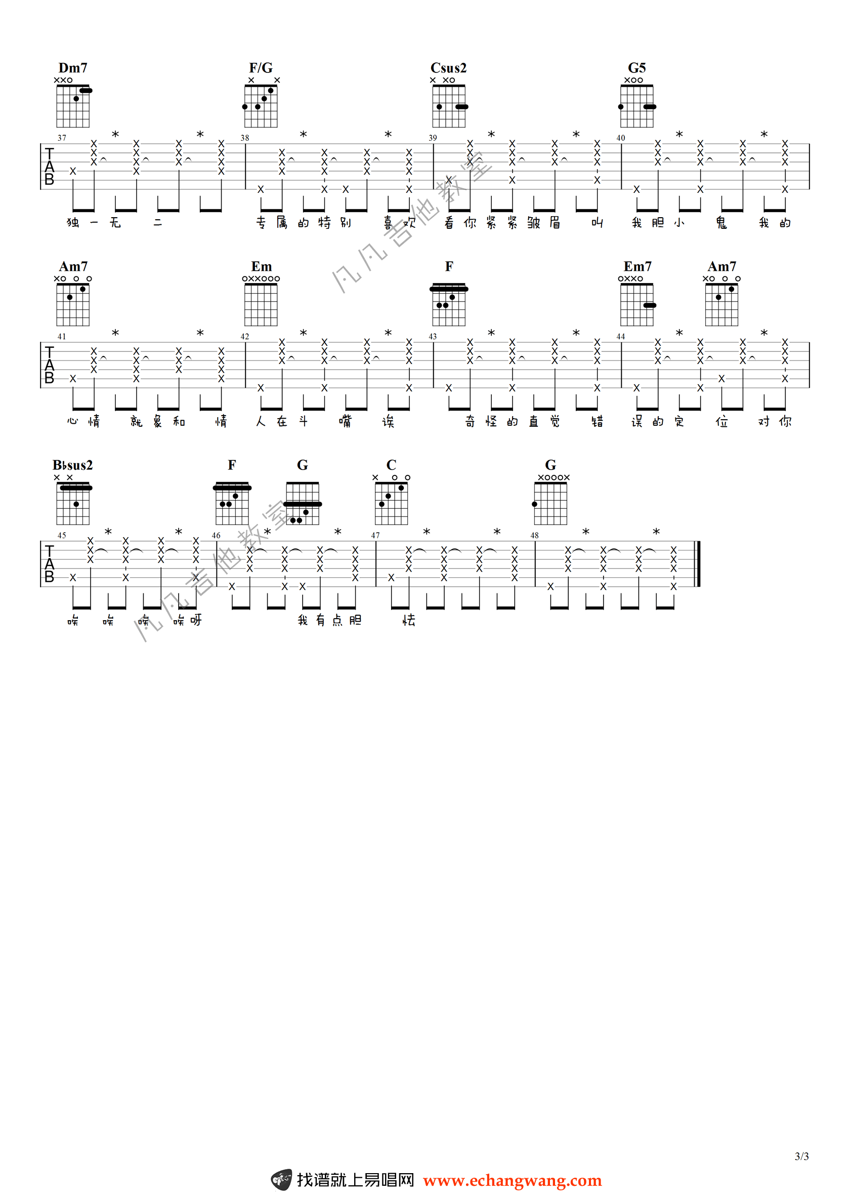 随谱附上吉他弹唱演示视频,琴友们可以根据个人情况使用变调夹,找到自己熟悉的音区去演唱。右手节奏通篇一样,相当简化,曲谱歌词和音符对齐了,方便大家对齐节奏,