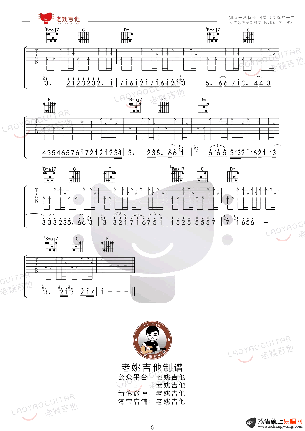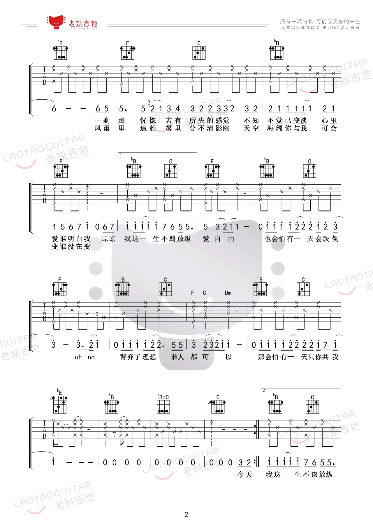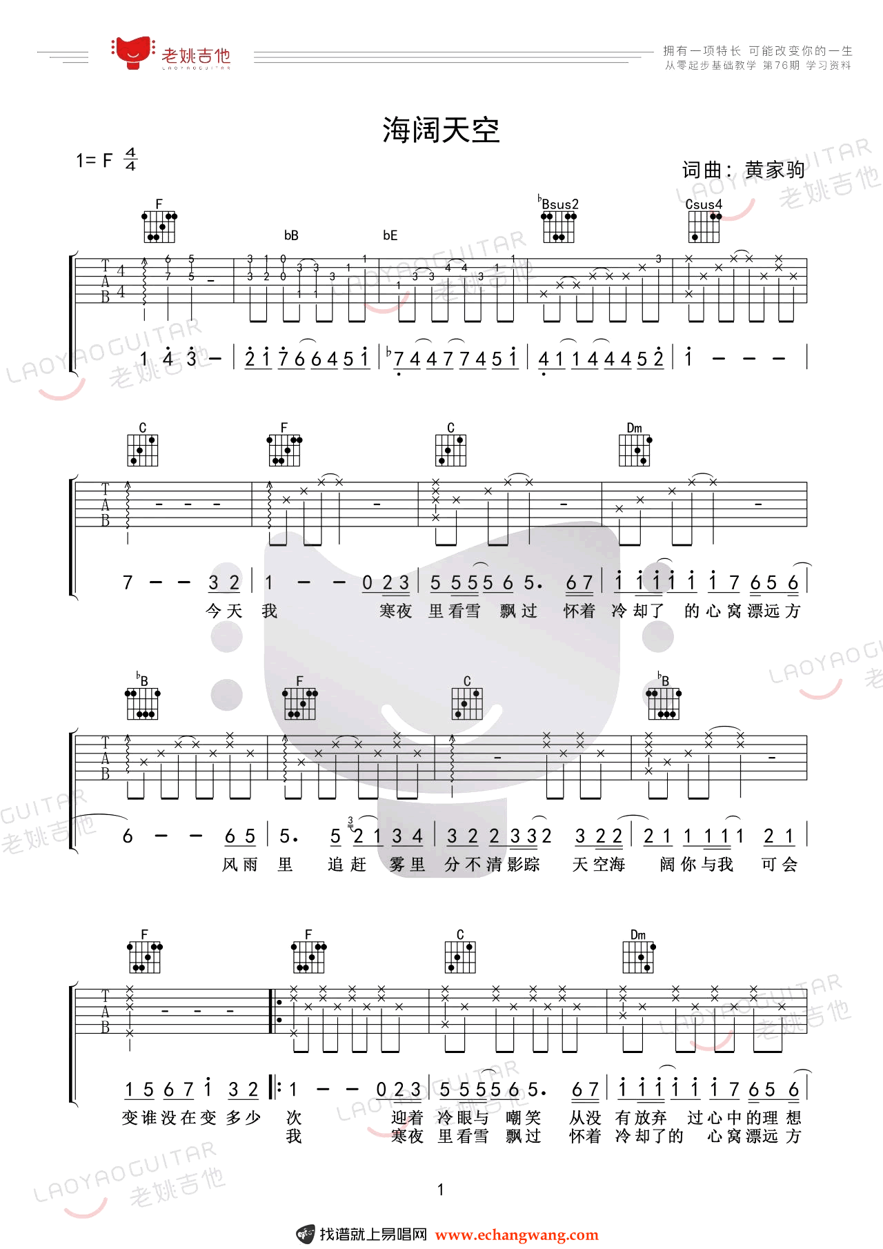 Beyond《海阔天空》吉他谱,一首经典粤语歌曲。海阔天空六线谱,高度还原版本,完整编配共五张图片谱。老姚吉他出品,易唱网整理上传。本次教学配合F调练习和六度音程等知识点。同步附上《海阔天空》吉他弹唱教学视频,琴友们参照老师的示范讲解进行学习。
