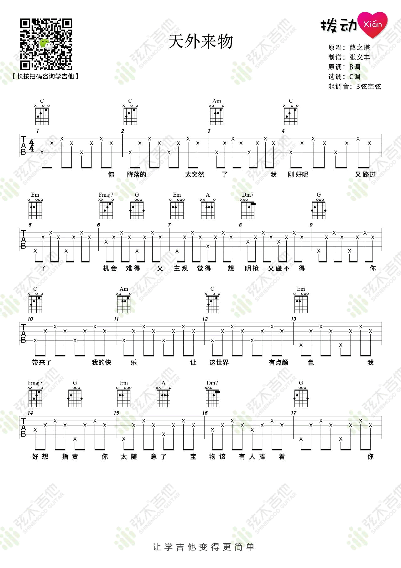 - 天外来物吉他谱_薛之谦_C调简单版_弹唱教学视频