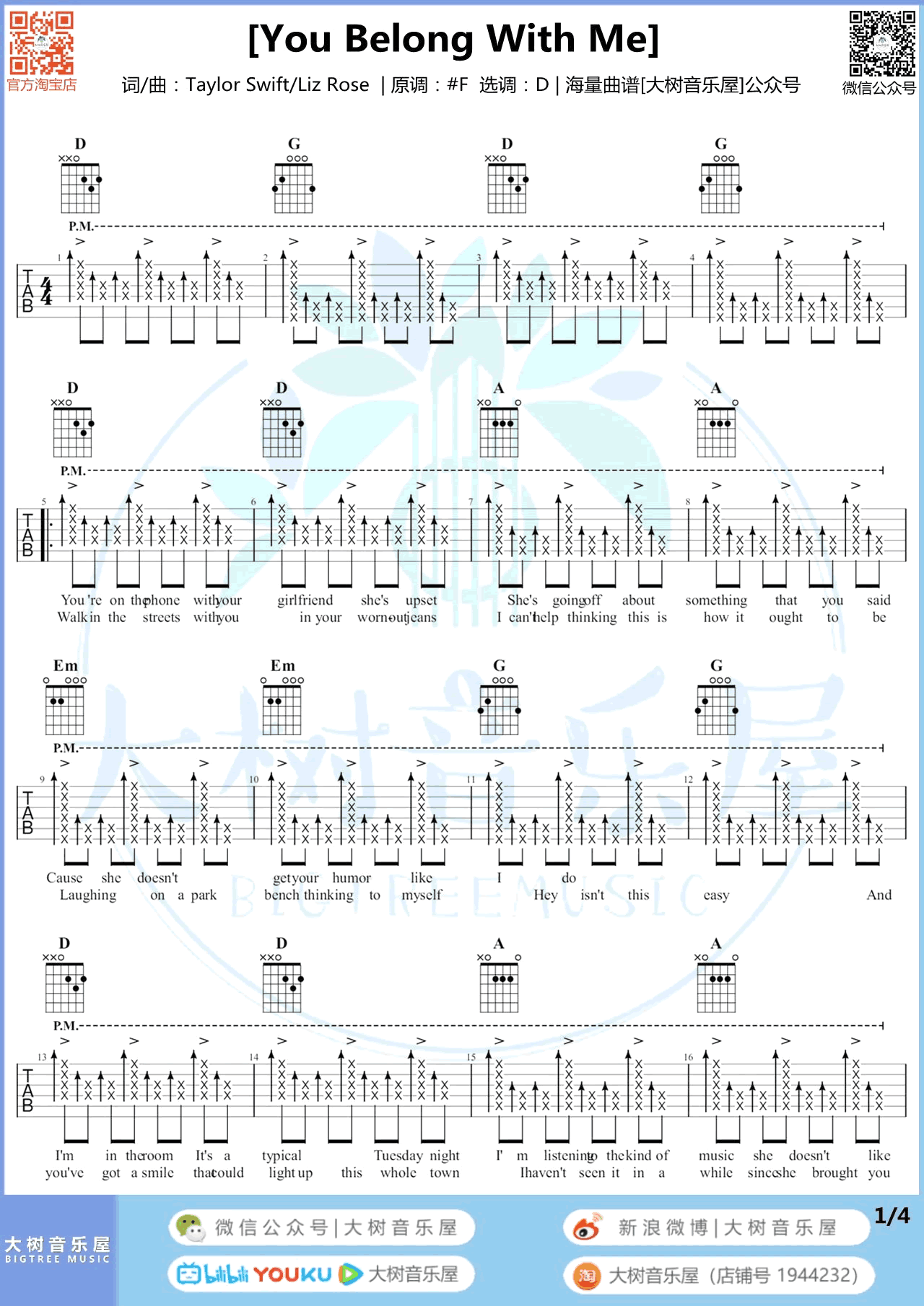 《You Belong With Me》吉他谱,Taylor Swift的一首英文歌曲,You Belong With Me吉他六线谱,选用D调指法编配,完整编配共四张图片谱。感谢大树音乐屋出品,易唱网上传整理分享。每个人的青春里,都有一首Taylor Swift~整首歌曲用到的和弦不多,一共只有四个,演奏中用到了闷音技巧,喜欢霉霉(泰勒·斯威夫特)的琴友们可以跟随橙子老师的教学讲解视频练习起来。