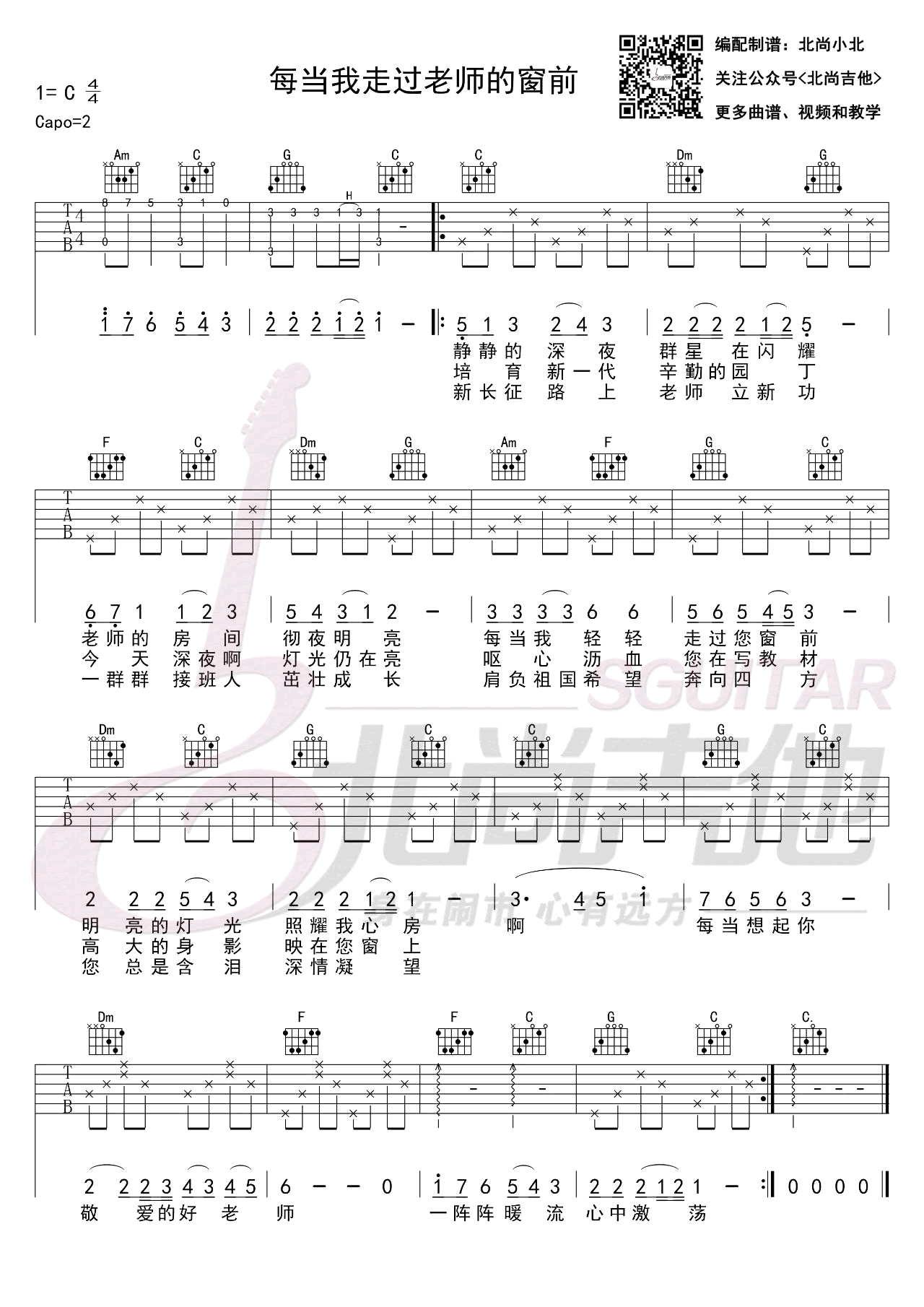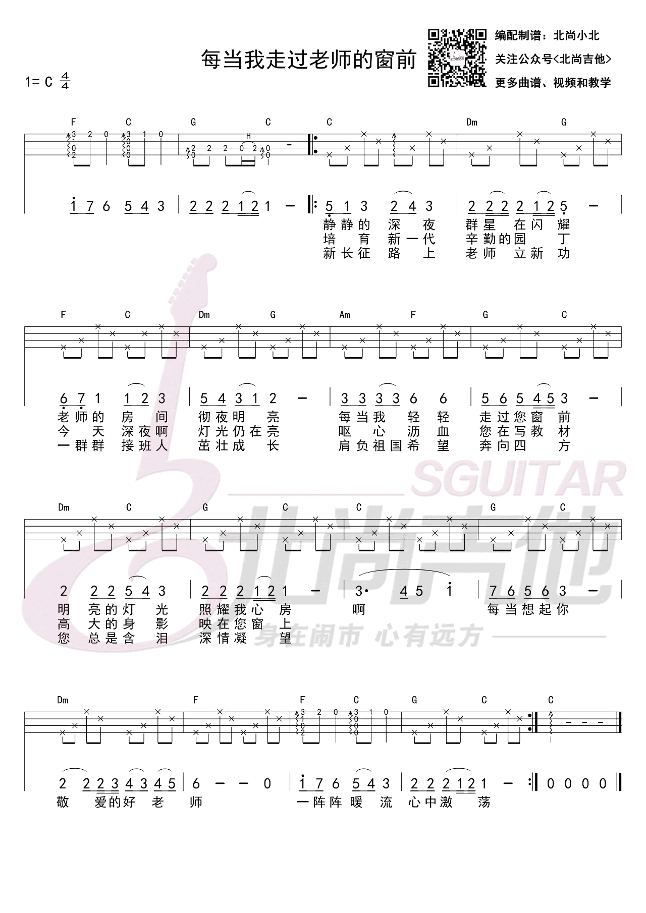 每当我走过老师的窗前吉他谱,一首经典传唱大江南北,成为一代人的回忆。每当我走过老师的窗前吉他弹唱谱,原调是D调,女声演唱比较高,可以唱C调版本,用变调夹夹2品就是D调了。感谢北尚吉他编配分享,易唱网整理更新。每个人的一生都有难以忘怀的老师,任岁月匆匆,始终记得他们的谆谆教诲。金秋九月迎来了又一个教师节,将这首歌送给琴友们,让我们真诚地对老师说一句,节日快乐!