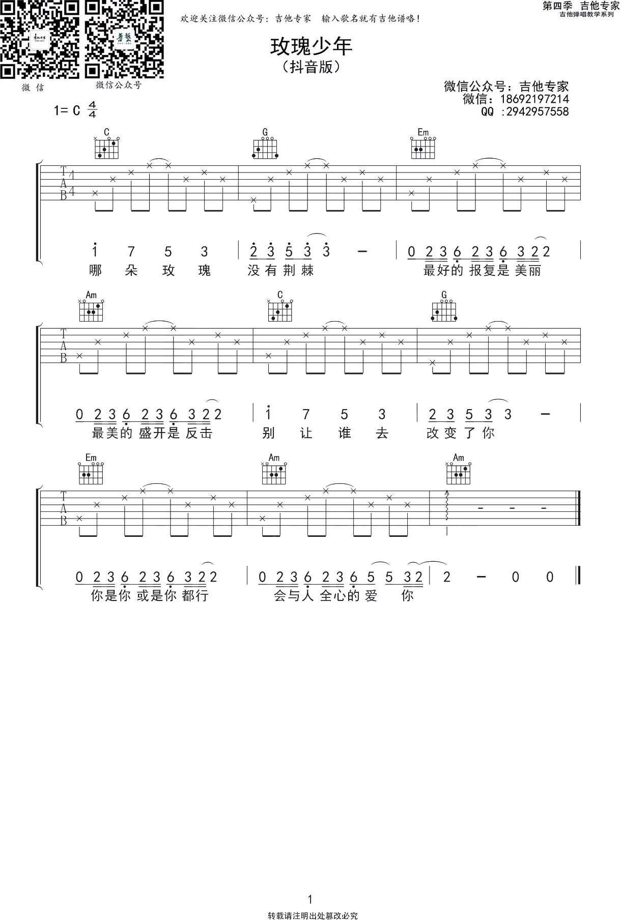 - 玫瑰少年吉他谱_抖音版_蔡依林/五月天_C调弹唱谱