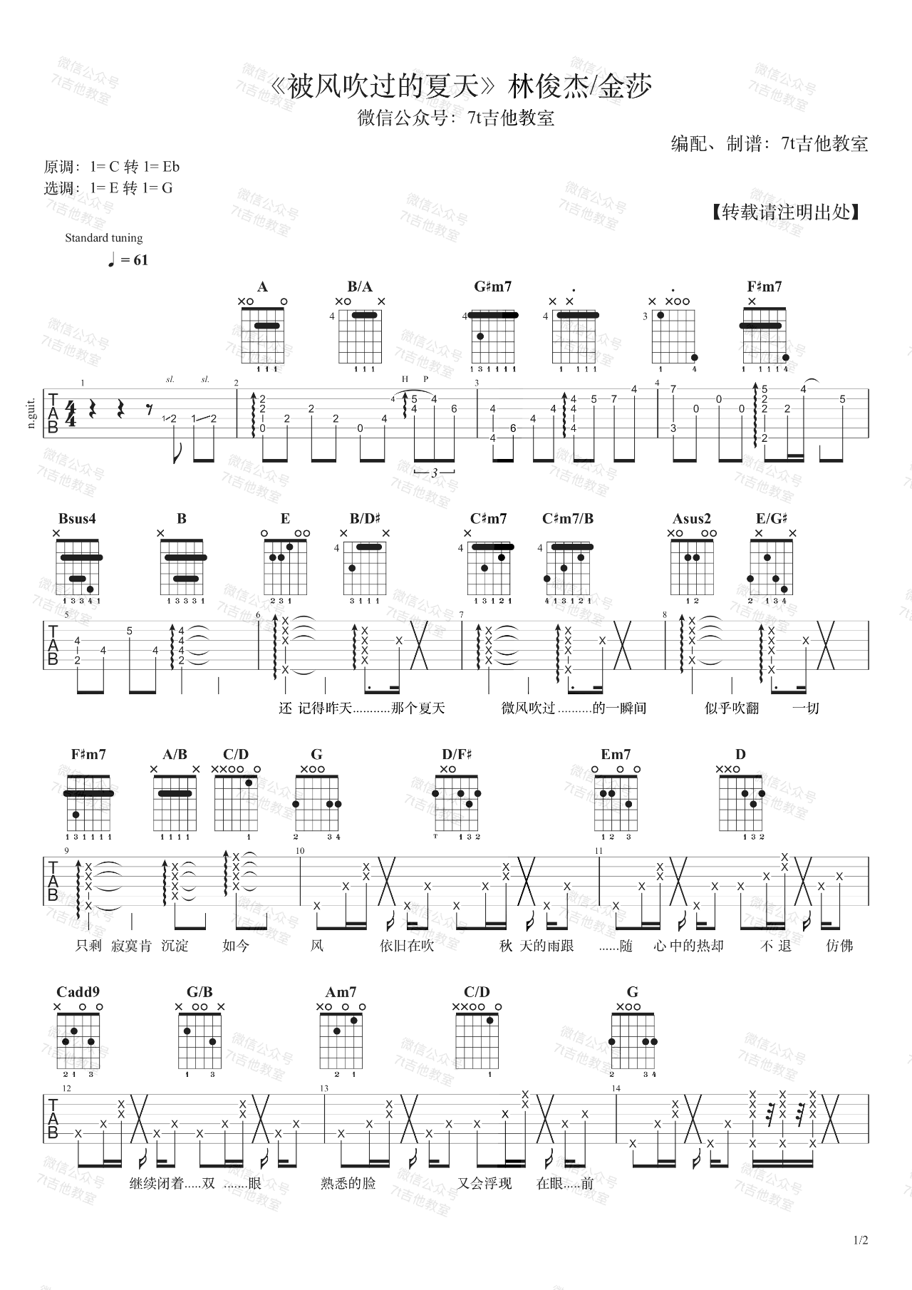被风吹过的夏天吉他谱,林俊杰金莎演唱的一首经典男女对唱情歌,被风吹过的夏天六线谱,原调是C大调转Eb大调,用的是E大调转G大调的指法来编配,视频里是降半音调弦,变调夹夹在第1品,也等于标准音调弦不夹变调夹。这个谱子不太适合唱原调,因为要夹太多品了。7T吉他教室编配和弦分析:首先基本的和弦色彩方面,四级用了sus2或add9;五级用了4/5;二级、三级、六级用了小七。 第一段是男声调,由于女声一般比男声的调要高,所以进入第二段的时候升了调,在升调之前用了女声调的五级来衔接,因为 5 → 1 是确立调性稳定感的一个重要进行,这种方式在转调里是很常见的。 整首歌基本上都是经典的卡农走向,并且用了很多斜杠和弦,使得低音有一个顺畅的下行 1 → 5/7 → 6m → 6m/5 → 4 → 1/3 → 2m → 5。