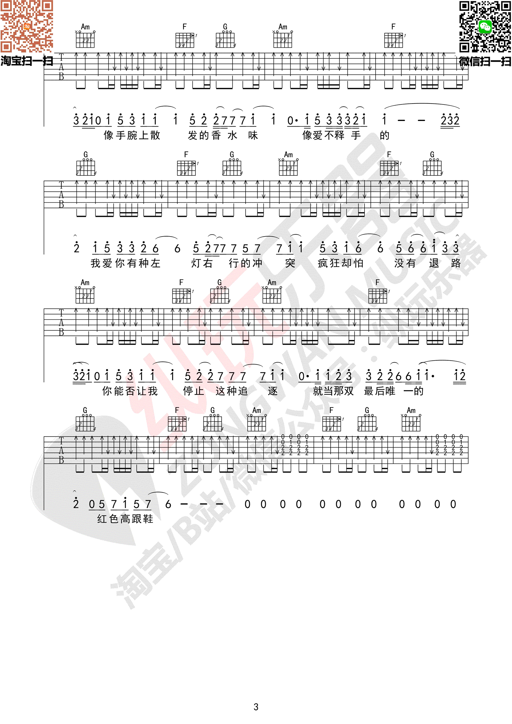 红色高跟鞋吉他谱,蔡健雅的一首经典歌曲,也是贺岁电影《爱情呼叫转移2》主题曲,红色高跟鞋吉他六线谱,三张图片谱。感谢酷弹乐器编配出品,易唱网更新上传。蔡健雅的这首流行金曲自发行之后一直热度不减,满满的暧昧和一丝求而不得的意味像极了高跟鞋,性感又热烈。随谱附上吉他弹唱视频,琴友们可以参照老师的示范练习起来。