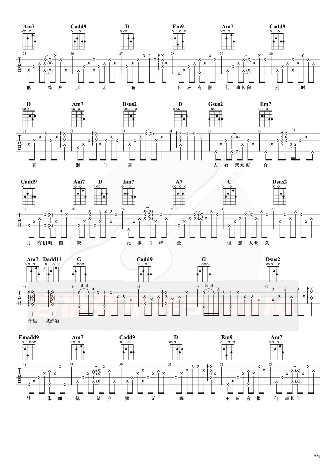 曲谱改编自张学友版本,邓丽君和王菲的版本也很好听。中秋节是我们国人很重要的传统节日,祝愿大家都能在假期里过得开心,奉上这首歌曲的的吉他谱,可以看着谱子唱这首歌给家人听。