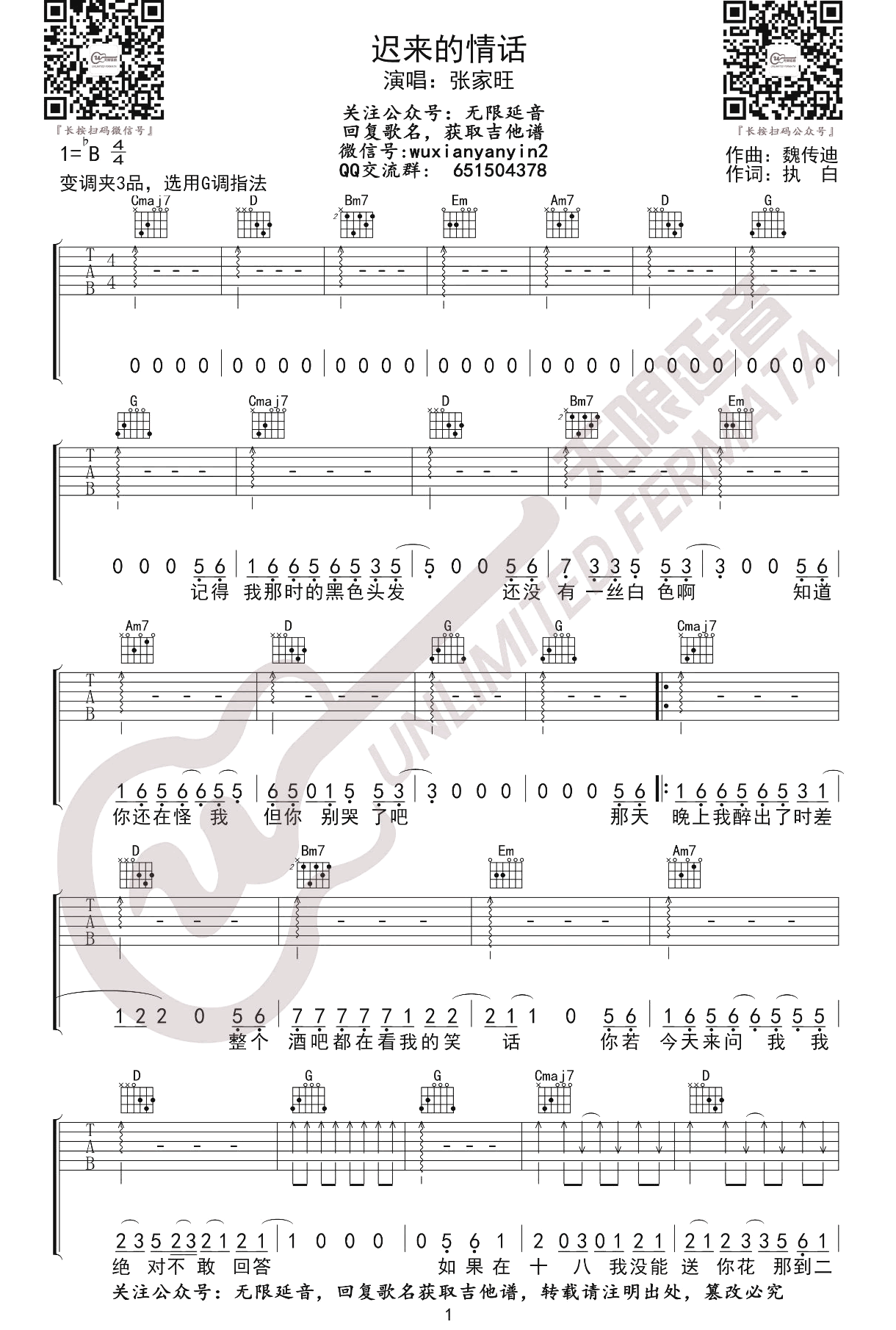 - 迟来的情话吉他谱_张家旺_G调_弹唱六线谱